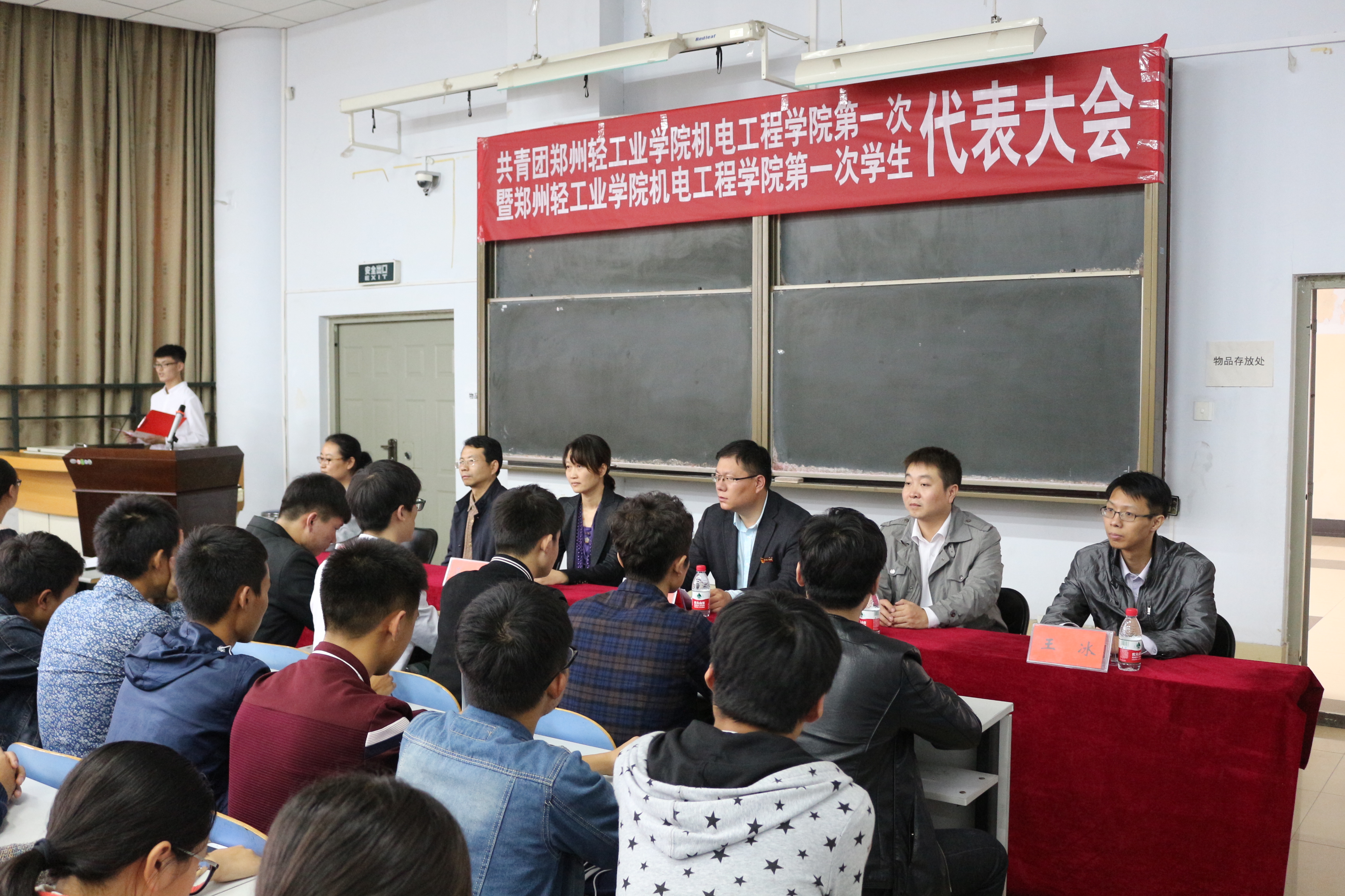2016年10月20日下午15:30,共青团郑州轻工业学院机电工程学院第一次团员代表大会暨郑州轻工业学院机电工程学院第一次学生代表大会在教三楼301隆重召开。机电工程学院党总支书记蒋玮老师、校团委副书记景志勇老师、我院党总支副书记罗楚新老师、校团委办公室主任王银峰老师、我院分团委书记马宇老师、我院学工办主任王冰老师以及学院其他辅导员老师和全体团员代表、学生代表参加了此次大会。