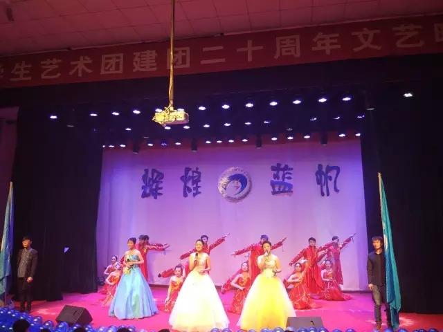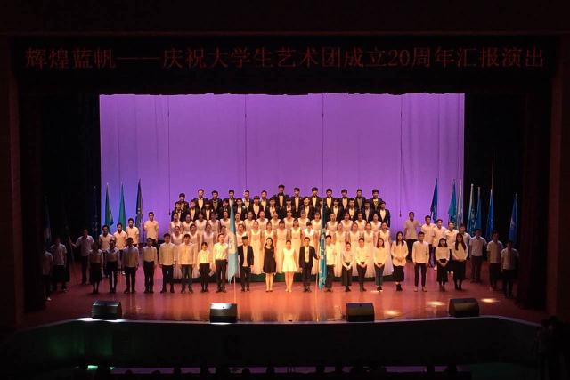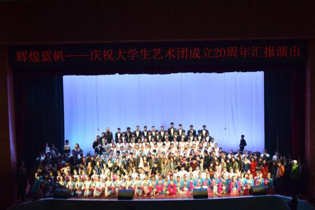 在科学校区,七点钟声已经敲响了,我们跟随着歌曲《相信》一起拉开了20年团庆的序幕。紧接着大学生艺术团新区分团团工委书记黄利,大学生艺术团新区分团团长、团工委副书记兼团务委员会主任范乙培进行了致辞,同时也对团庆宝宝进行了生日祝福,也对回到艺术团参加团庆的校友们表示了欢迎。首先进行的是演出的第一篇章峥嵘岁月,情景诗朗诵《情书》道出了艺术团儿女在为艺术团书写壮丽的诗篇。在青春的道路上我们遇见彼此,并携手走上这蓝帆之旅。就像流行联唱《我依然等待你的归期》歌里唱到的那样:在无尽的黑夜,我的梦快要毁灭,至少我还有梦,还有你。中西乐器的结合最是美妙动听,器乐团一首《乐动人生》带我们走进音乐的世界。《醉梦心蓝》民族舞与现代舞的来回切换,似温婉,亦雄宏,意犹未尽……小合唱《瑶山夜歌》优美婉转,让你我沉醉。接下来我们掀开了第二篇章《时代赞歌》,校友代表发表了讲话,96级的学长的讲话令在座的每一位艺术团成员容。五大中心和舞美剧务队首次登台,带我们《仰望星空》;魔术队《Special Birthday》让我们走入不一样的魔幻世界;性感的拉丁,随性的街舞,养眼的爵士,舞蹈串烧《Earthquake》舞动青春,舞出精彩。音乐和话剧的结合,一幕幕熟悉的片段,《你好,话剧社》带给了大家满满的回忆。紧接着进入最后一个篇章《扬帆远航》,服装表演队总能惊艳全场,《future with you》带给大家美的享受;民美联唱动人心弦的《冬日恋歌》,是你我都曾经历过的爱恋,是冬日一抹暖阳;从民乐合奏《奇迹》中我们倾听到青春的萌芽,在悠扬的旋律中静静徜徉;民族舞《淮河水长长》用她们的舞姿诉说那幽怨绵长的爱。晚会的结尾再次唱响《新世纪的阳光》,艺术团儿女永远在一起,共同沐浴在金色阳光下,我们的艺术团,永远年轻。