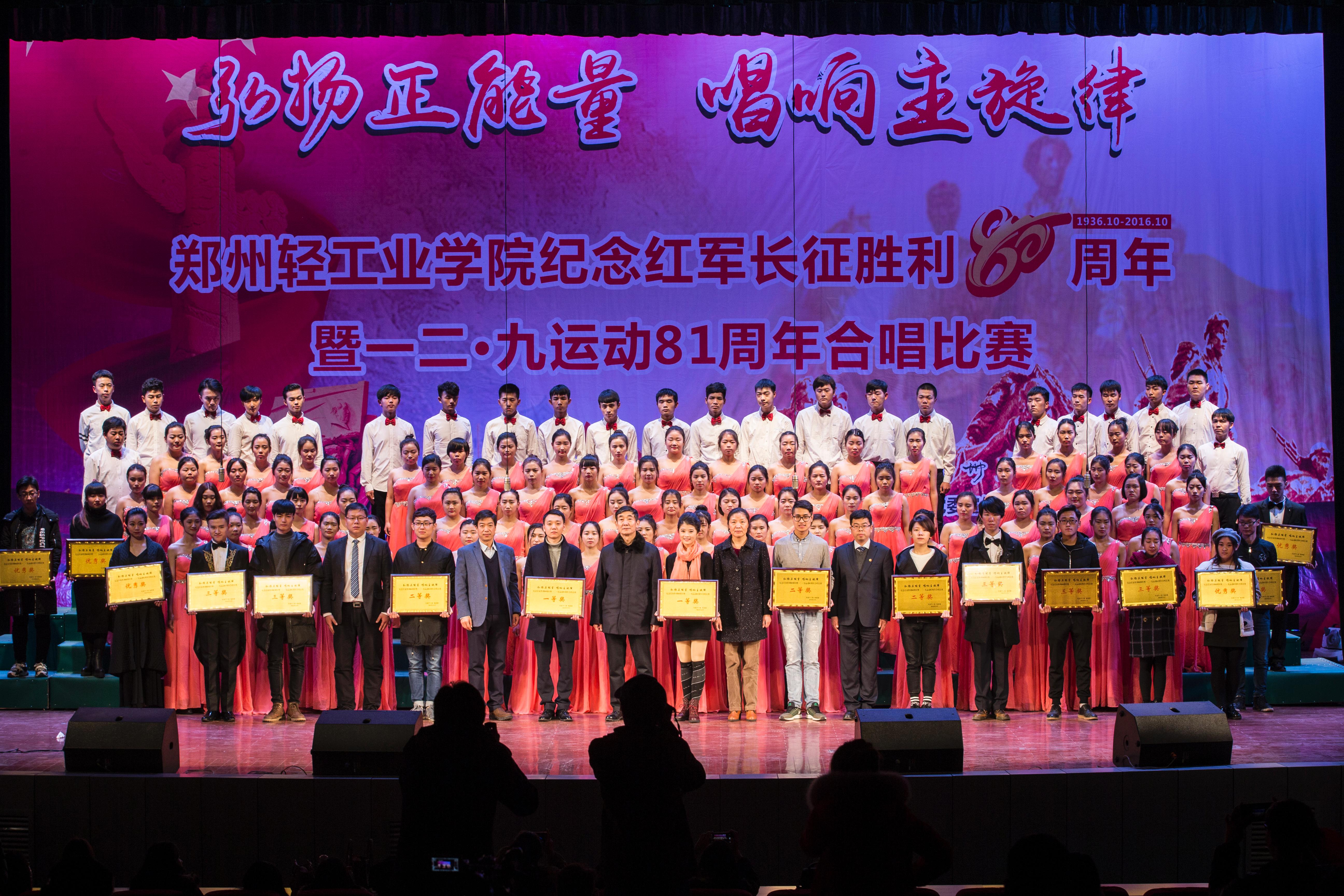 1211日下午,我校纪念红军长征胜利80周年暨“一二•九”运动81周年合唱比赛在东风校区大礼堂隆重举行。此次比赛由党委宣传部、党委学工部、校团委主办,全校16个学院的代表队参加了比赛。校党委副书记窦效民教授出席并为获奖单位颁奖,宣传部、学工部、团委负责人和各二级学院副书记、分团委书记、专兼职辅导员及近1000名师生现场观看了比赛同时,在直播平台上有15669人观看了比赛,比赛播出时期有2万多次点赞。