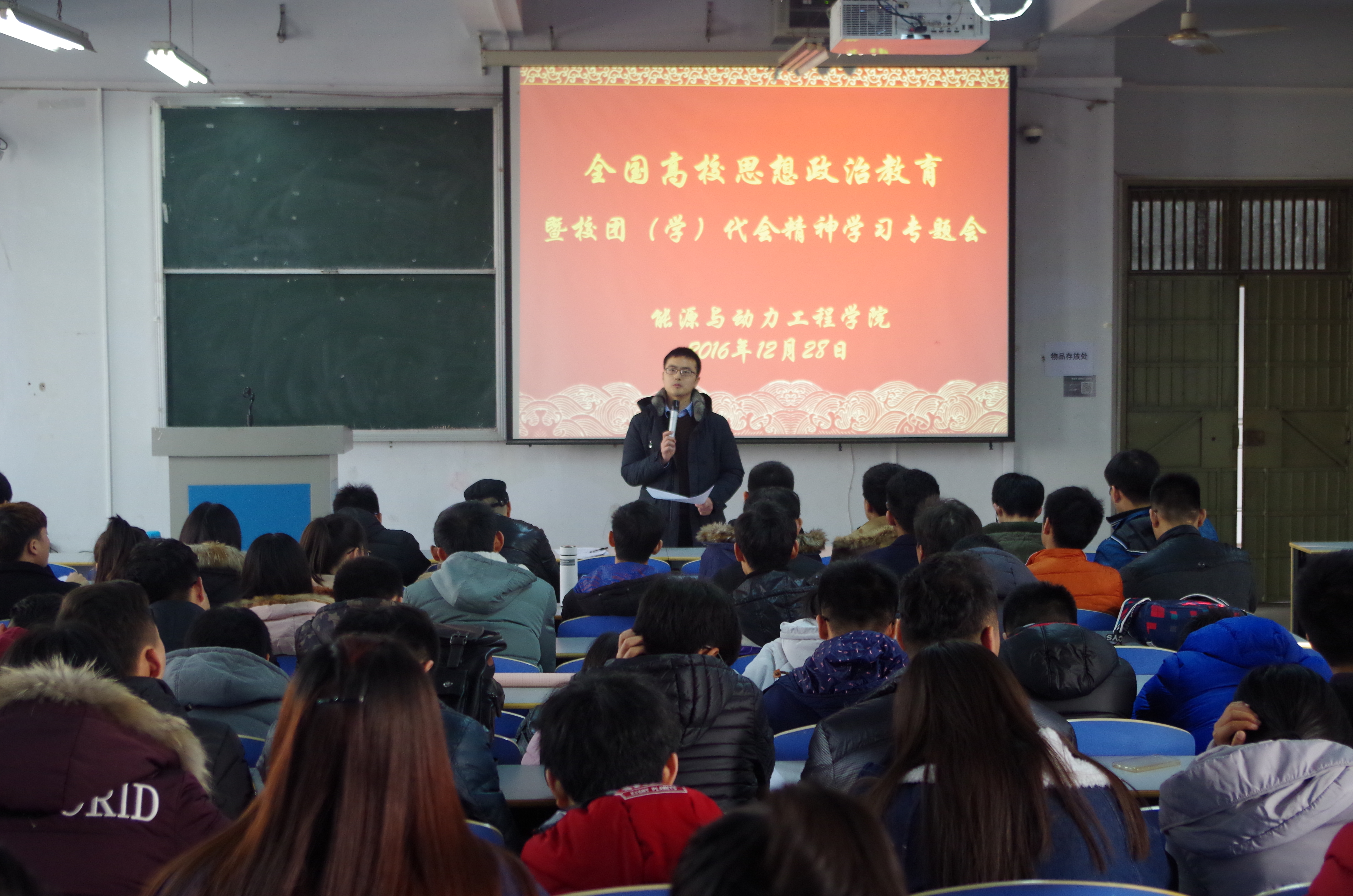为深入学习、贯彻、领会全国高校思想政治工作会议和校团(学)代会精神,12月28日中午12:10能源与动力工程学院在西五楼314召开了全国高校思想政治工作会议暨校团(学)代会精神学习专题交流会,学院分团委副书记王耿华老师和全体学生干部及学生代表参加了此次大会。