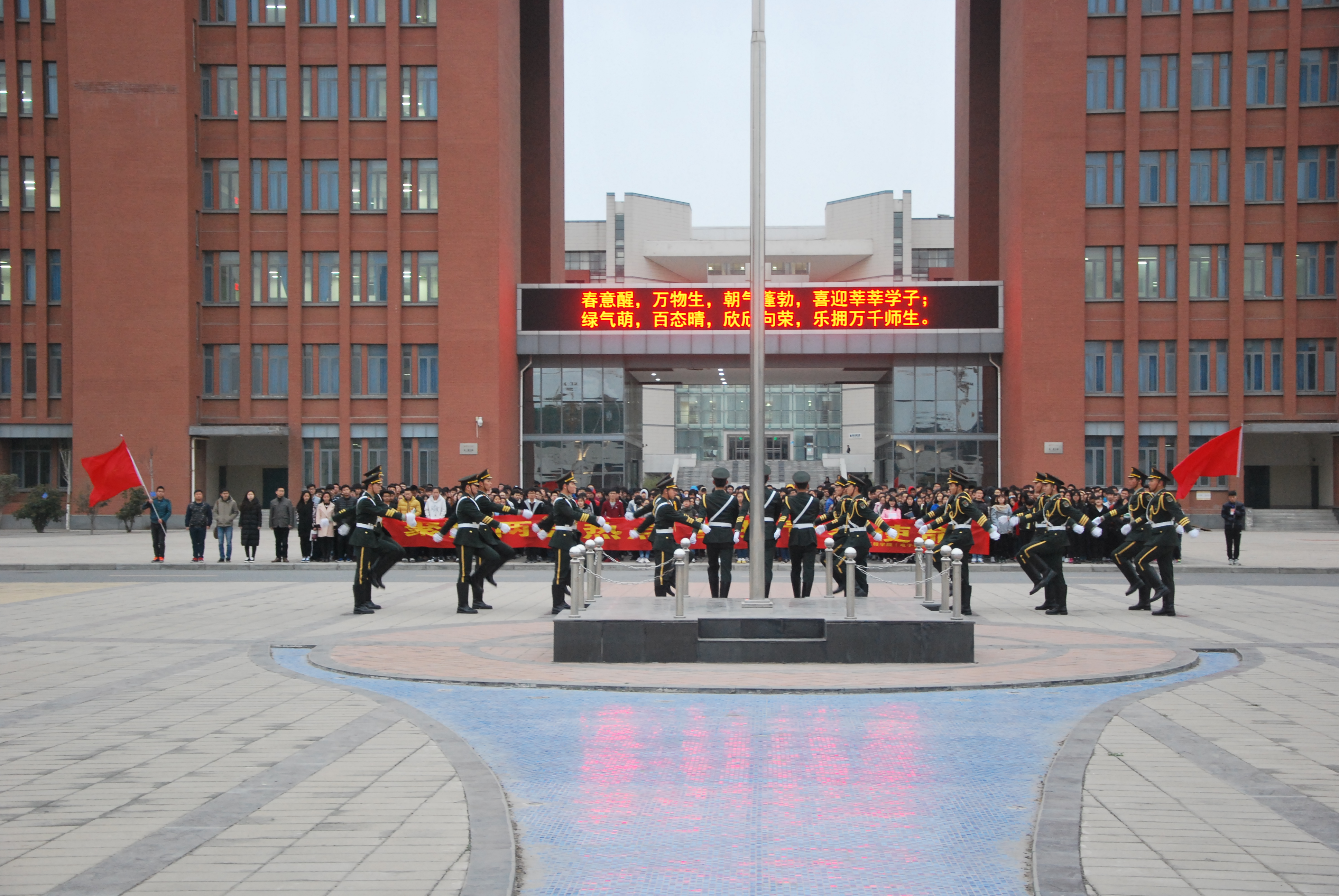 2017年3月13日计算机与通信工程学院(电子信息工程学院)举行了以“聚焦两会热点,勇担青春使命”为主题的升旗仪式。学院分团委书记沈高峰,辅导员杜明明、艾怡静老师以及800多名学生参加了此次升旗仪式。