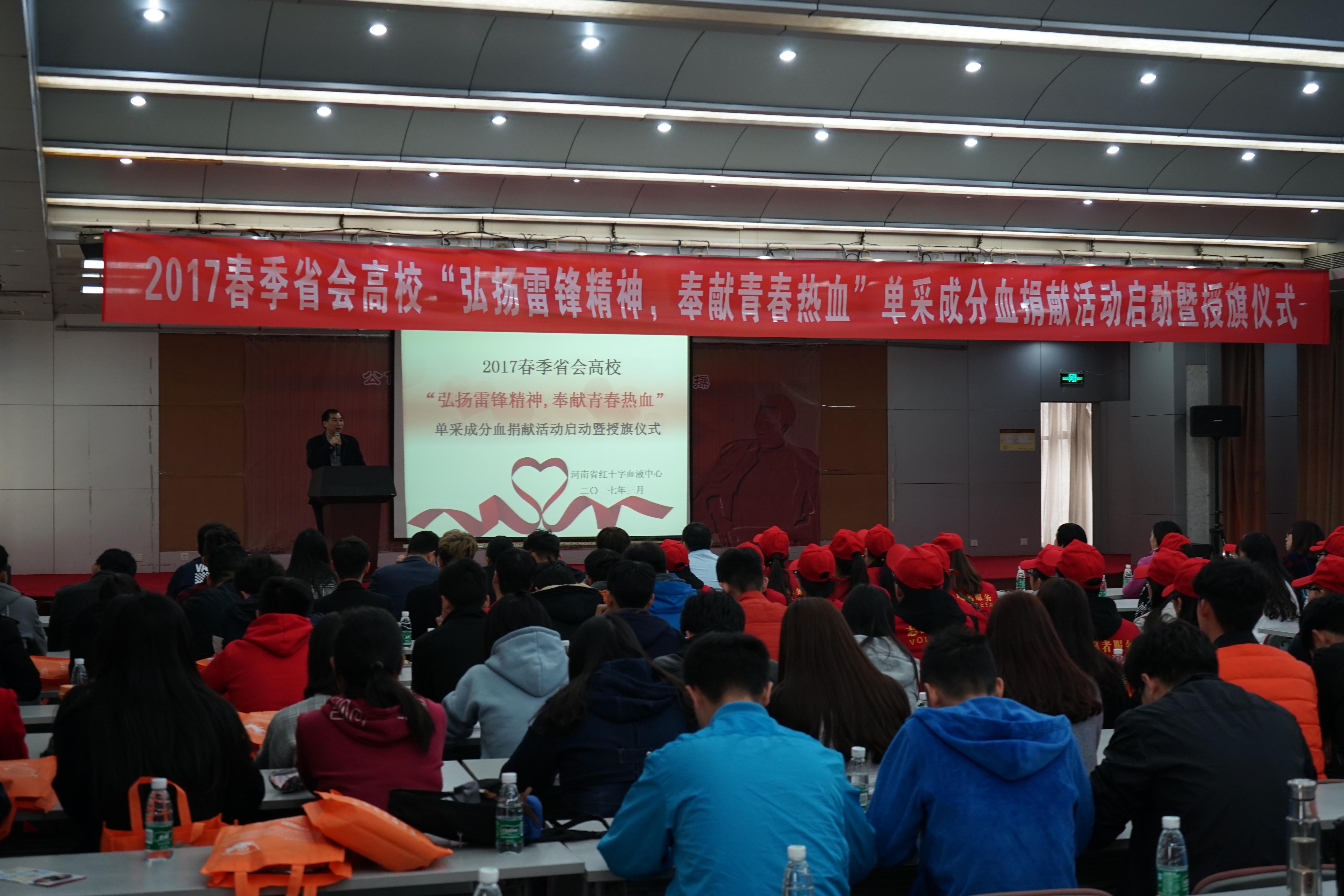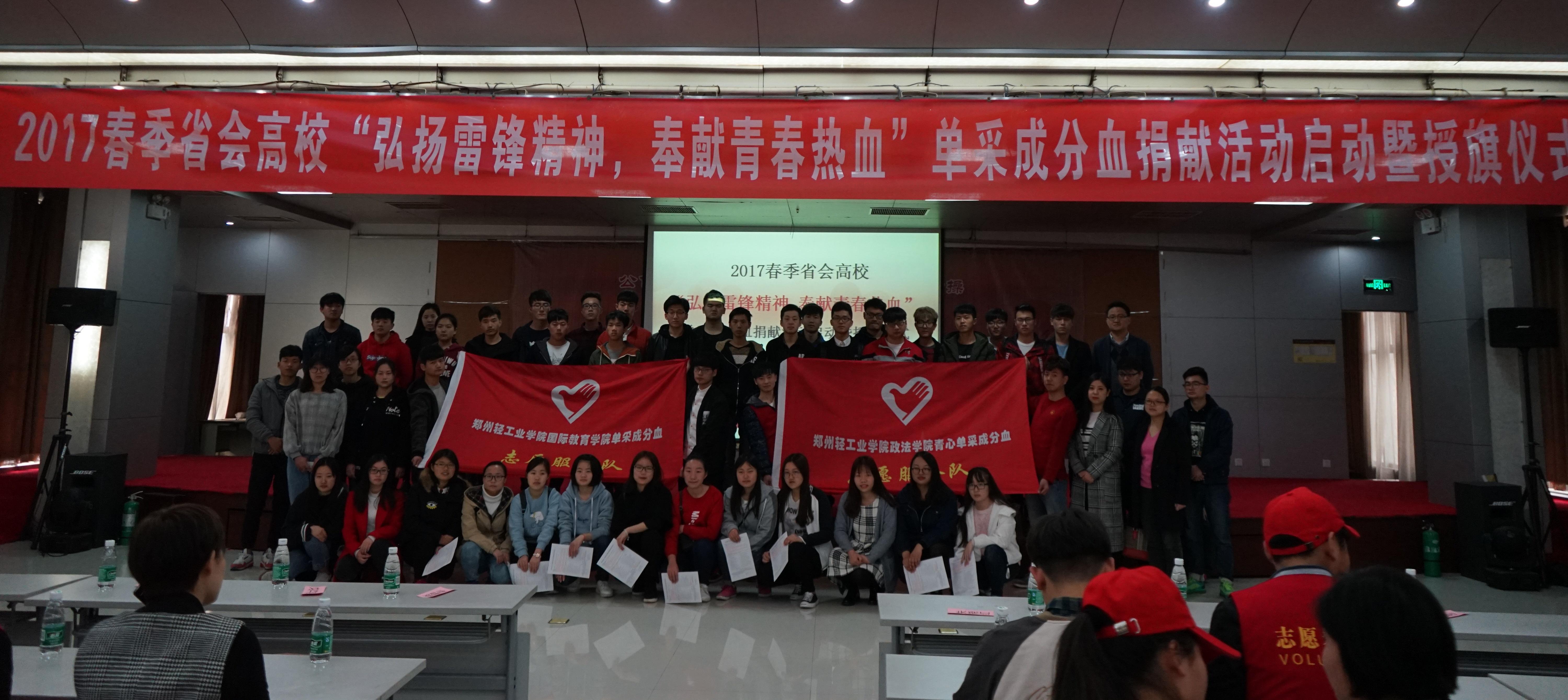 311日,河南省红十字会血液中心2017春季省会高校“弘扬雷锋精神,奉献青春热血”单采成分血捐献活动暨授旗仪式在省红十字会血液中心举行,我校政法学院、国际教育学院、青年志愿者协会60余名师生参加了授旗仪式,受邀参加授旗仪式的还有河南牧业经济学院、河南医学高等专科学校和郑州职业铁路技术学院的志愿者师生代表。