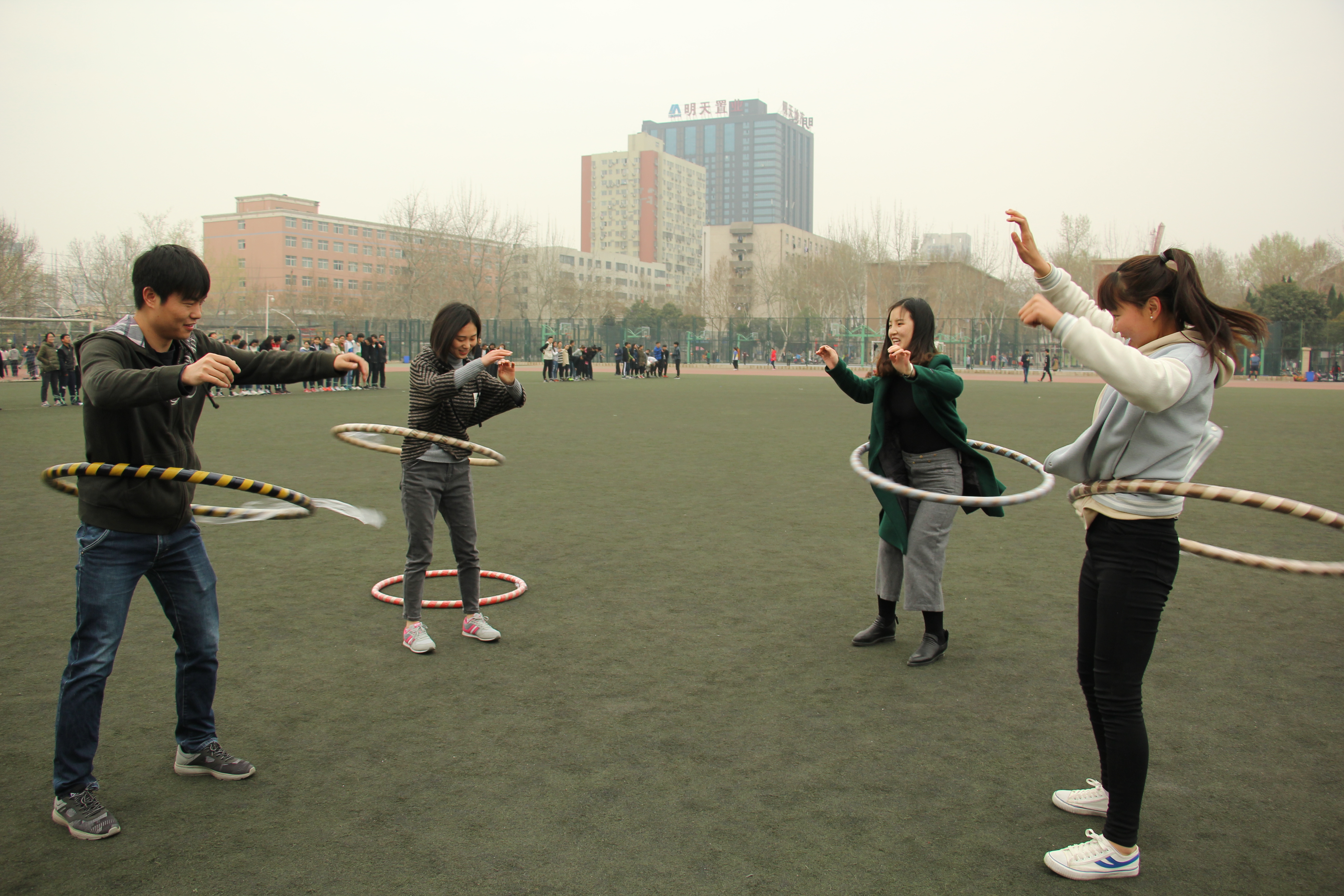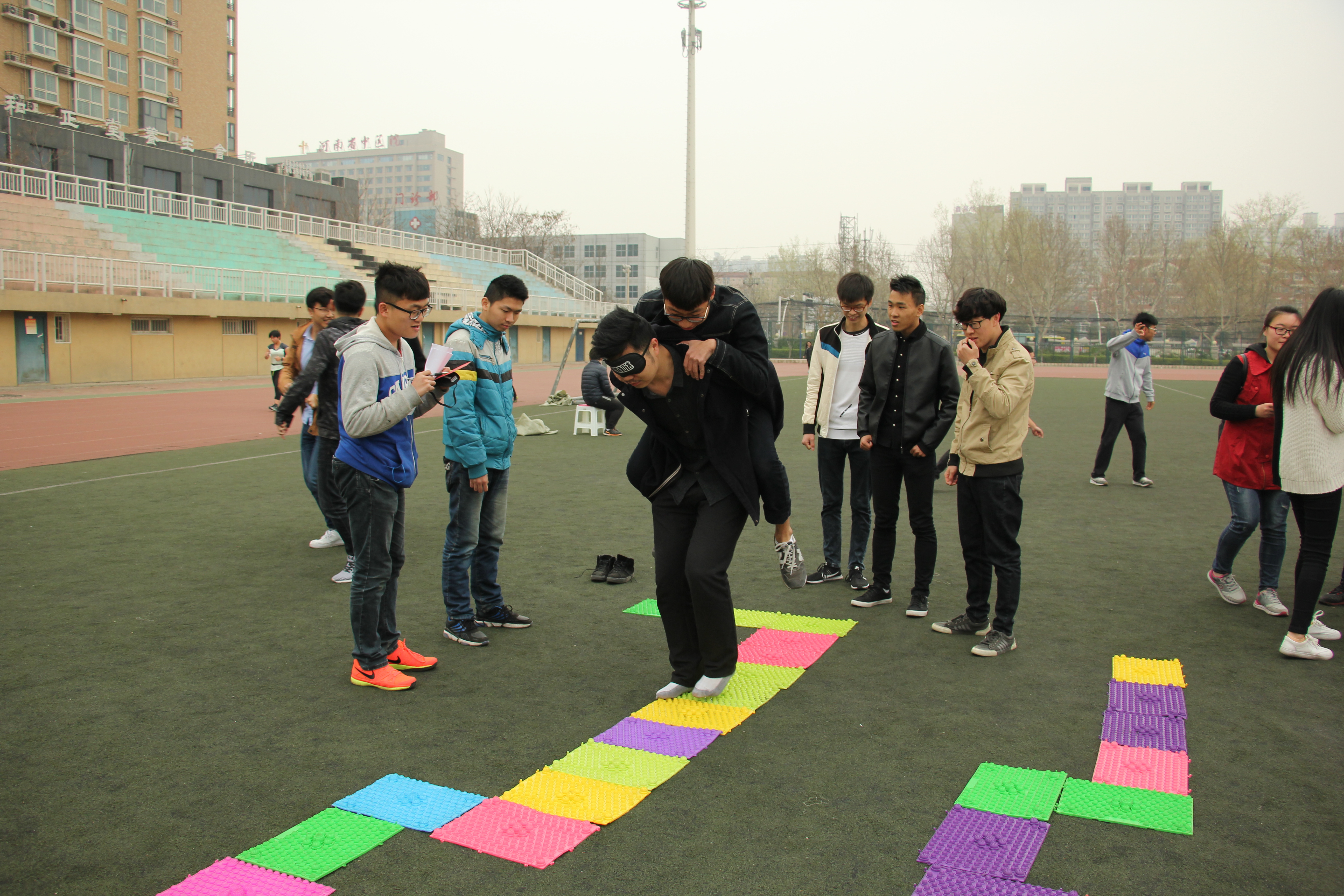 上午9点全体人员在操场主席台前集合,工作人员对参加素质拓展的成员进行抽签分组,分为五组。首先,由各个游戏的负责人对活动规则进行介绍。接着,小组之间同时展开比拼。活动共设置了“袋鼠跳”、“交头接耳”、“信任之路”、“穿越呼啦圈”、“解手链”、“名牌大爆炸”共六个比赛项目。
