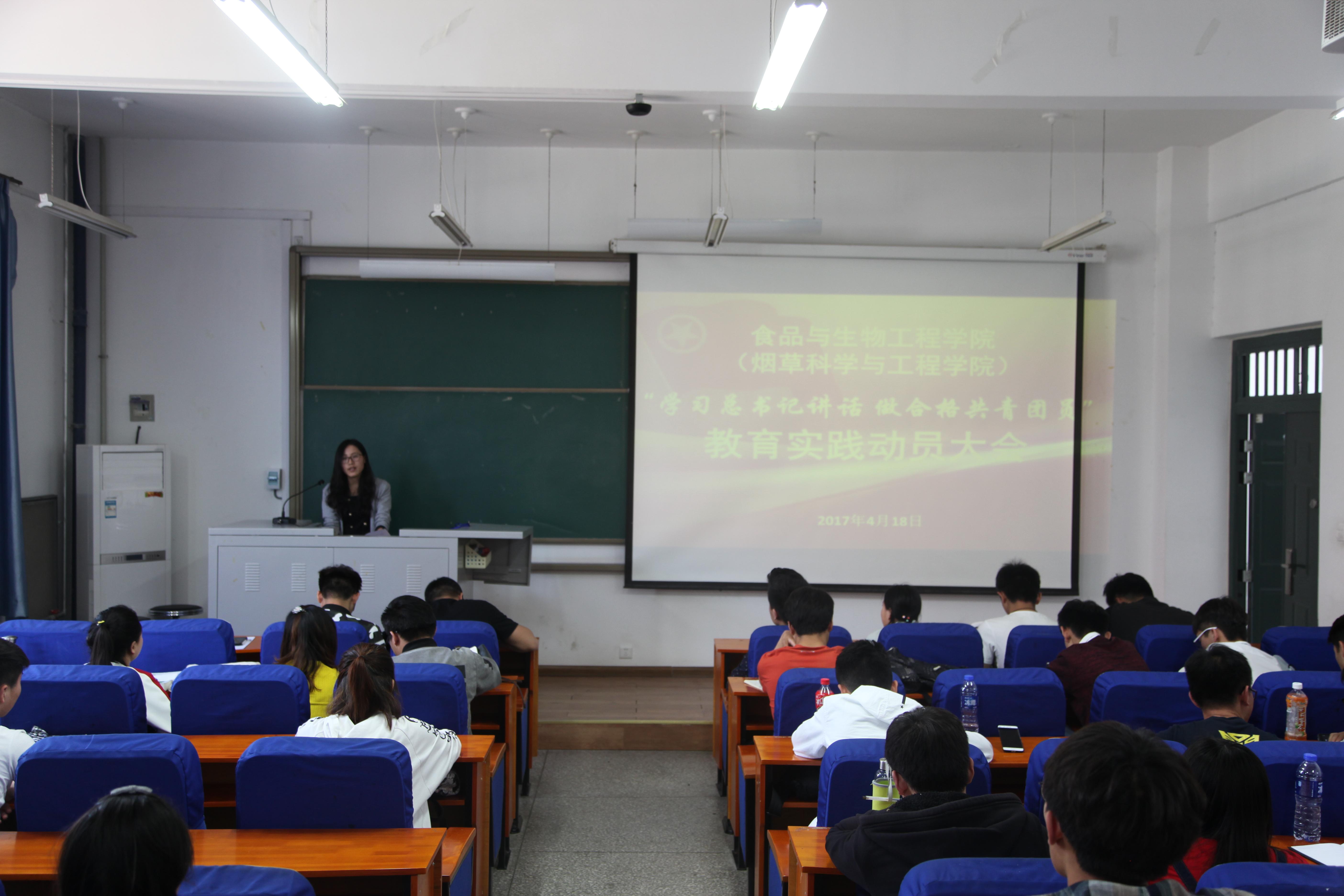 为深入学习习近平总书记系列重要讲话精神,贯彻落实“学习习近平总书记讲话 做合格共青团员”教育实践活动精神,充分调动团员青年的先进性和积极性,深入推进我院共青团工作的改革,食品与生物工程学院(烟草科学与工程学院)于4月18日中午在食工楼209召开了“一学一做”教育实践动员大会,学院分团委书记王楠老师、2016级辅导员张书铭老师及全体本硕团干、团员代表参加了本次会议。
