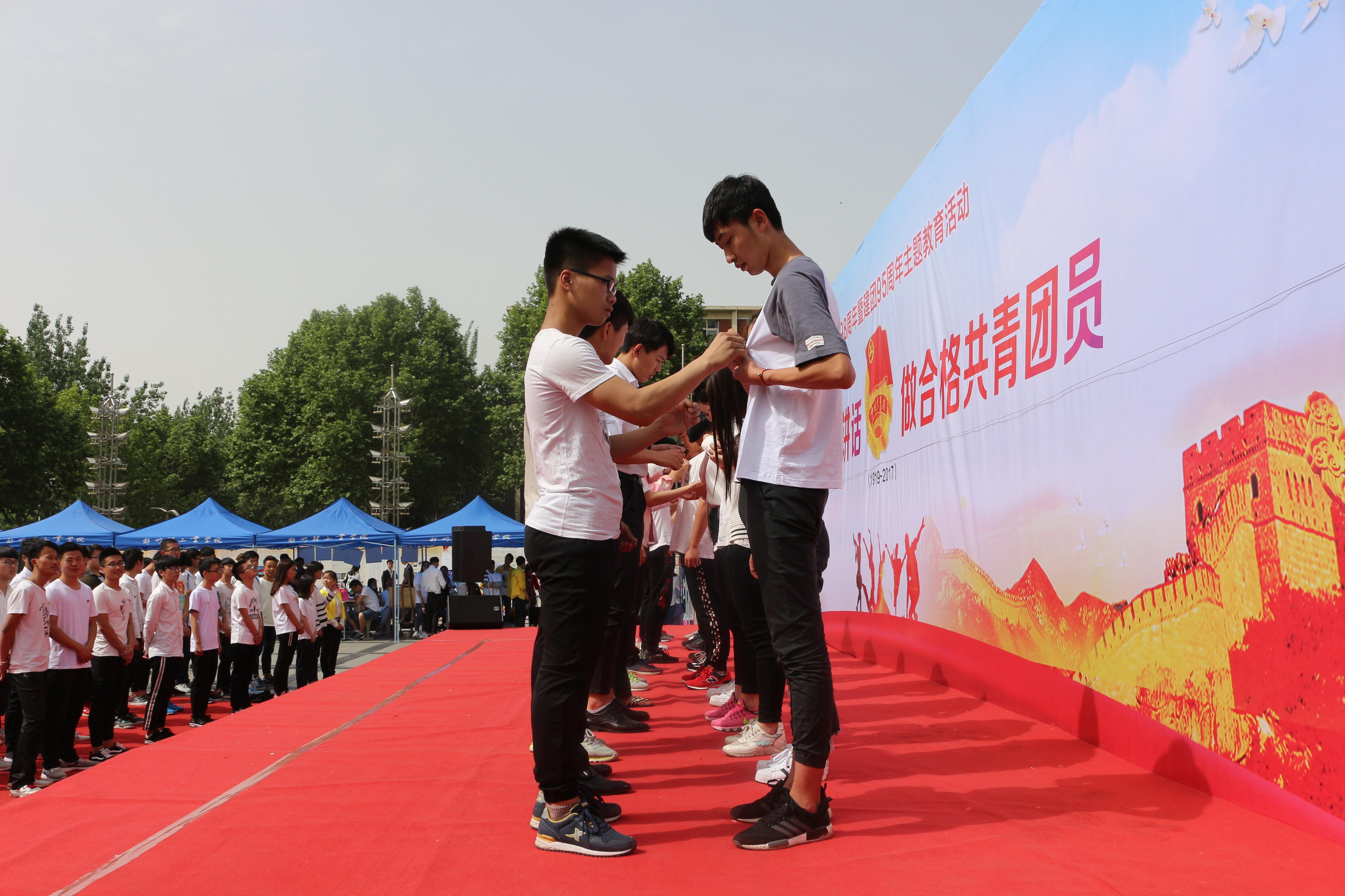在庄严的国歌声中,此次活动拉开了序幕。陈璐老师宣读了2017年新入团的102名团员名单,老团员代表为每一位新团员佩戴团徽。随后,在新团员代表的带领下,新团员们面对着团旗,右手握拳,开始了庄严的宣誓:“我志愿加入中国共产主义青年团,坚决拥护中国共产党的领导...”。宣誓完毕后,新团员代表朱二涛谈了自己加入共青团的感受以及自己以后要承担的责任,表示新团员们以后要更加严格要求自己,时刻起到模范带头的作用。老团员代表对新发展的团员表示欢迎,希望可以一起与新入团员一起共同努力,奉献自己微薄的力量。马宇老师代表团干对参加活动的团员青年们提出了要求,希望大家能够尽职尽责,艰苦奋斗,努力学习,崇尚科学,追求真知,为团旗增辉添彩,为早日成为国家栋梁之材而发奋图强。最后,在激昂的团歌声中,此次活动取得了圆满成功!