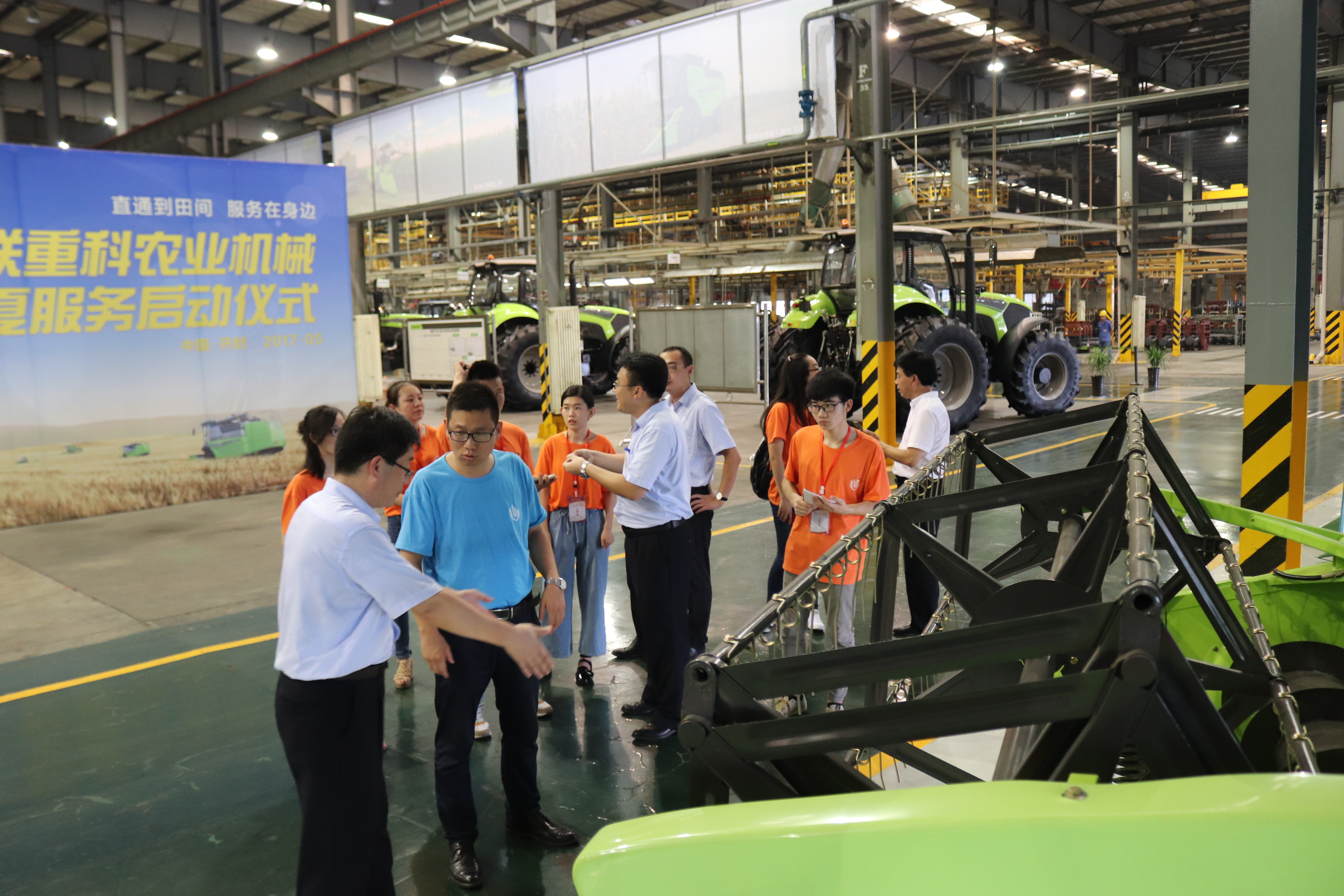 7月12日下午,队员们来到中联重科开封工业园。在参观过程中,队员们首先了解到中联重科的2+2+4战略,快、好、强的战略目标和全程机械化的产品战略。然后在讲解员的讲解下,大家了解到一台拖拉机的生产全过程,包括混线生产模式中所用到的各种高端技术及其更新进程。随后大家又参观了几种多用机,尤其是秸秆综合利用的机器受到队员们的全体称赞。之后,队员们来到中联重科农机服务信息中心,了解到三夏麦收服务进度、服务直通到田间、信息化公益服务、公益收割献爱心等企业优良文化,在指挥中心中联中考农业机械智能化服务平台上,队员们可以清晰的看到全国各地服务的机器,通过GPS定位,可以实时为出现故障的机器提供服务,这极大的保证了科技助农的效率。在最后的座谈过程中,队员们又了解到中联重科的发展历程、企业文化以及下一步发展目标等信息。