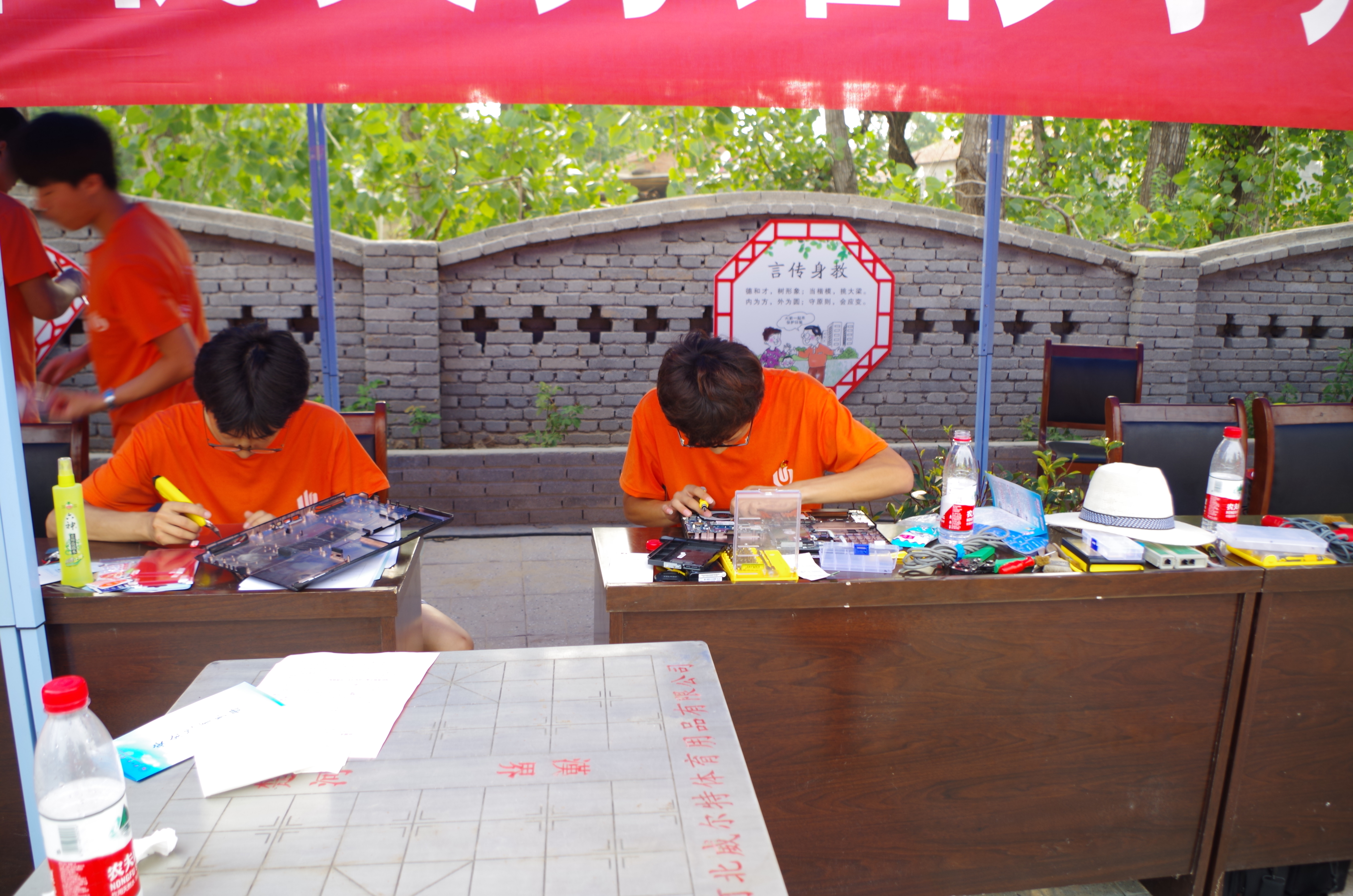 “服务社会,e路随行”大学生“绿风尚”电脑义务维修小分队利用所学专业知识,为村民提供计算机维修、手机维修、手机贴膜等服务,除了维修之外,小分队成员还向村民介绍了正确使用计算机的方法和计算机维护方面的知识,为居民日常使用电子产品带来了方便。