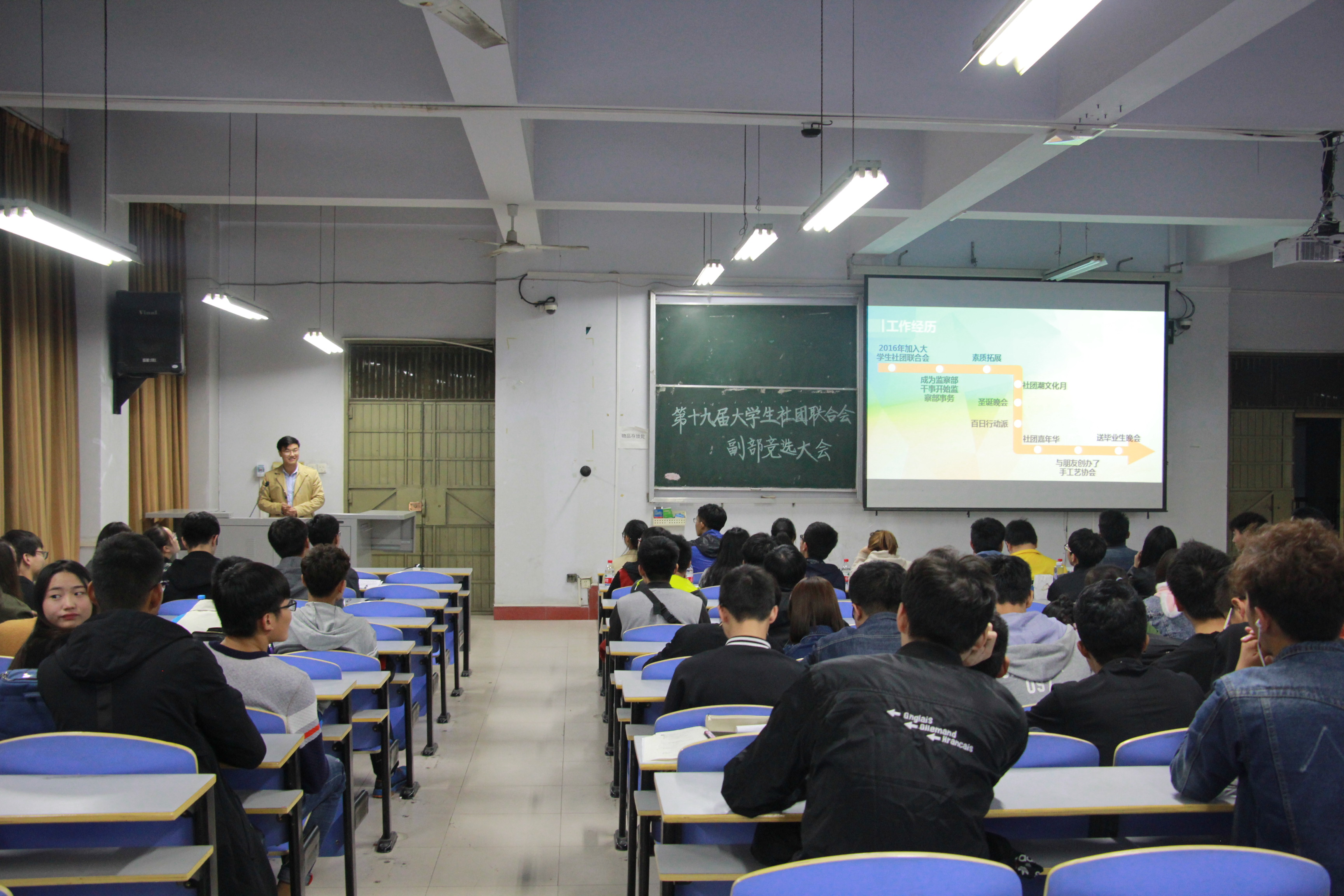 11月2日,大学生社团联合会在西五楼210举行了第十九届副部换届大会。到场的评委有:第十八届常务副主席闫一林、第十八届秘书长李楠、第十九届团工委书记史晨曦、常务副主席陈云、团工委副书记陈佳丽、副秘书长王慧洁、副主席兼监察部部长左文思、网宣部部长杨帅、办公室主任郑浩、组织部部长朱奕柯以及各部门成员。