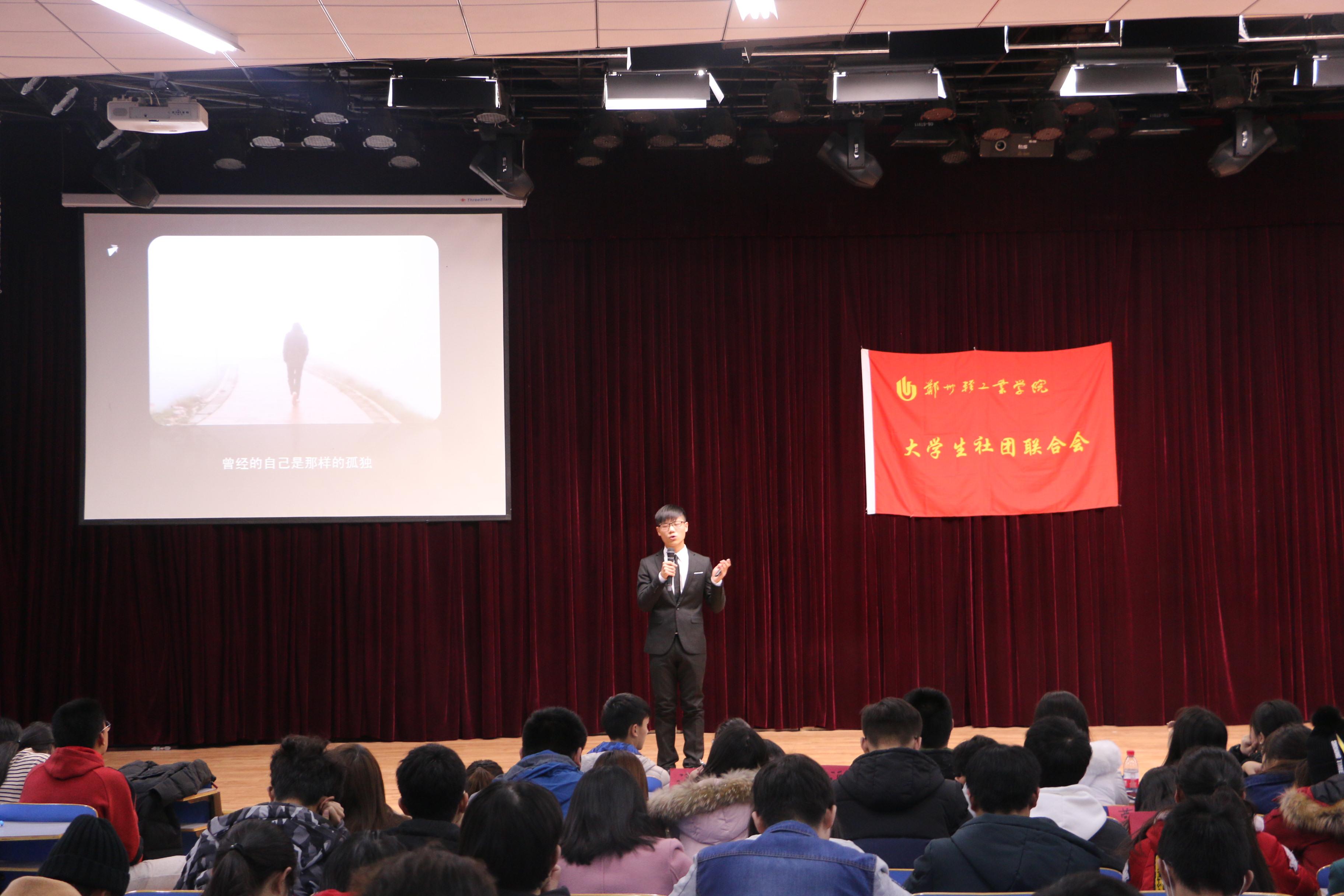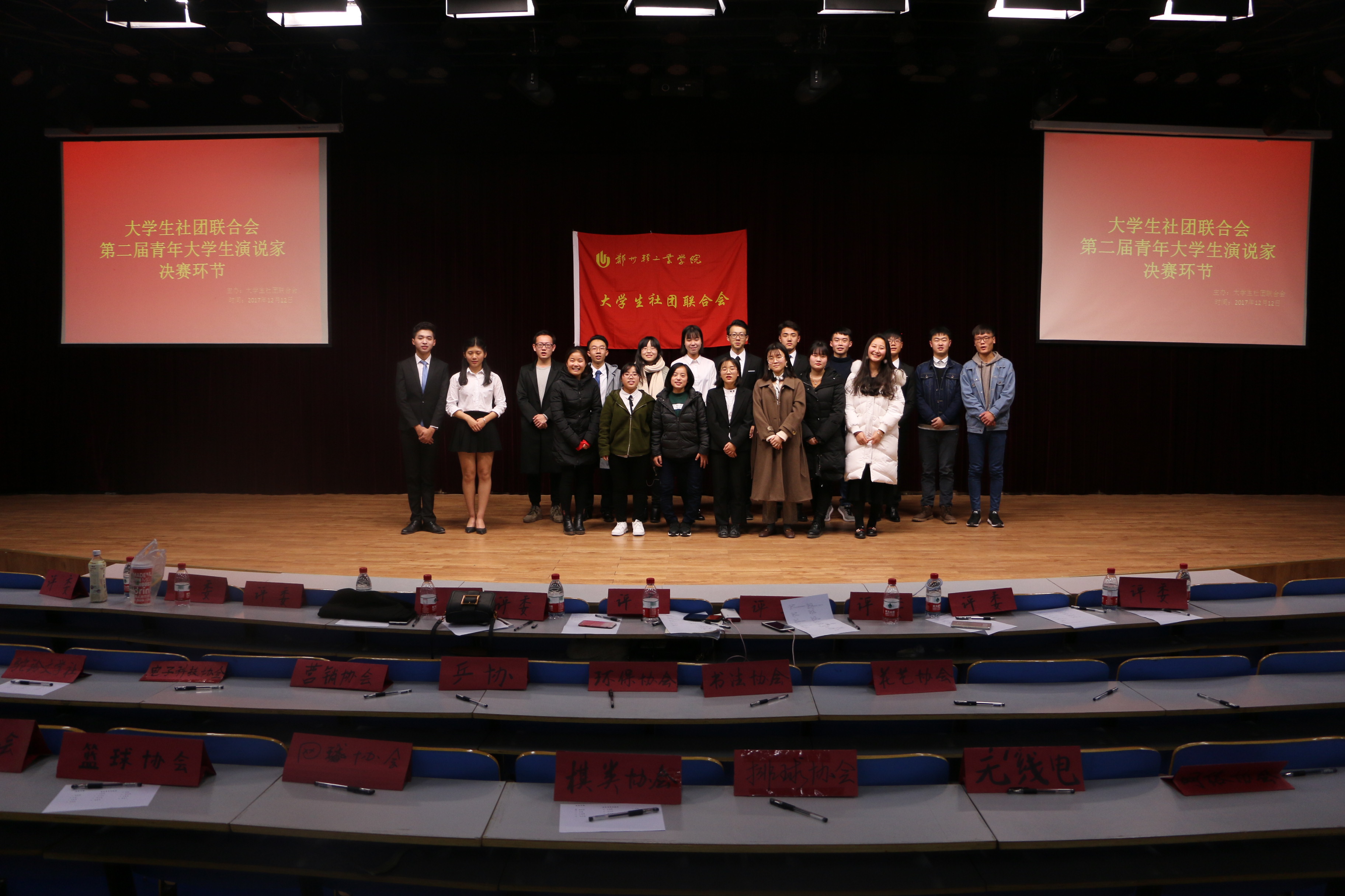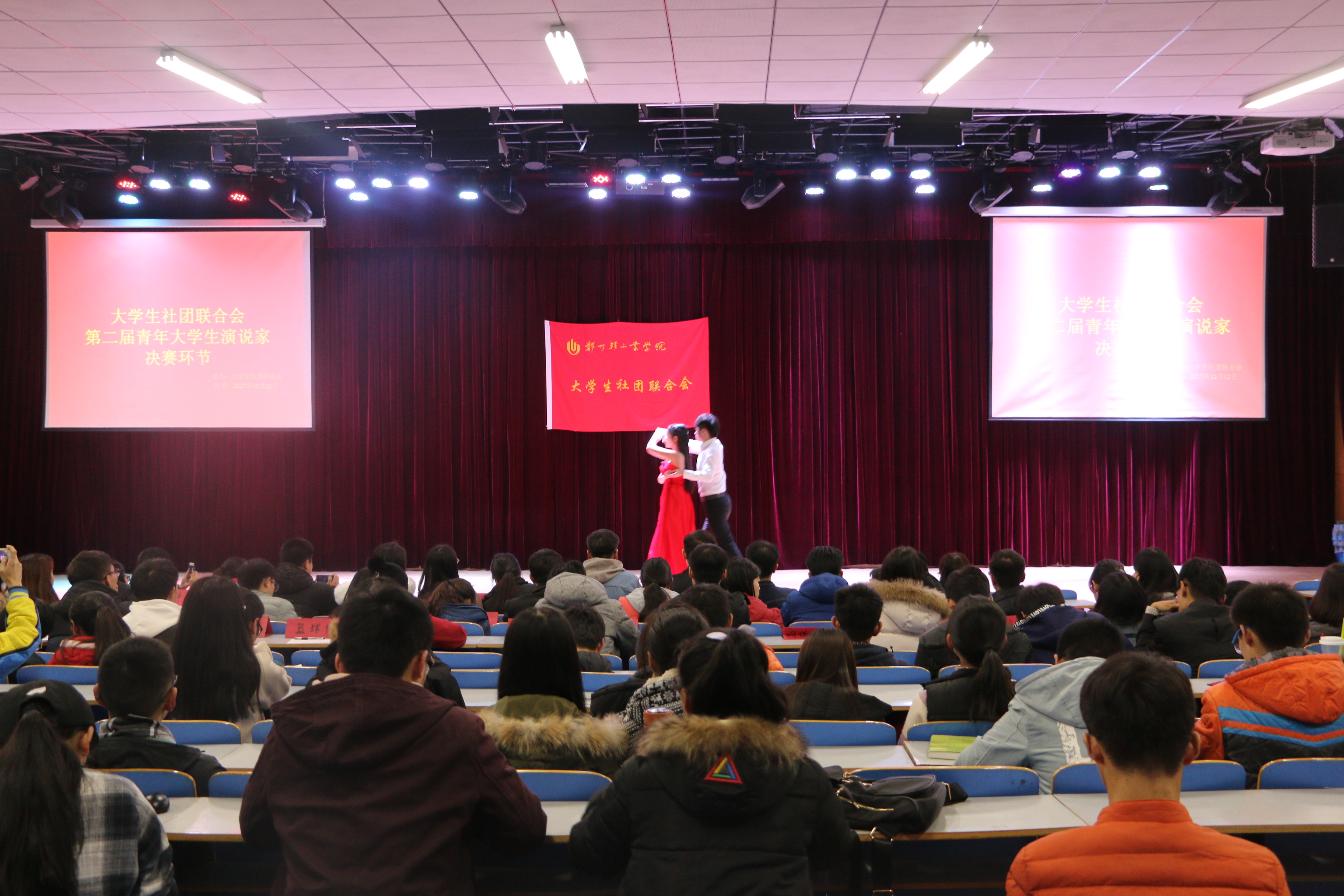 为了纪念一二九运动的开展,培养同学们的爱国精神。12月13日,由大学生社团联合会主办的第二届大学生青年演说家决赛在科学校区大学生活动中心208室成功举办。出席本次演讲比赛的嘉宾有大学生社团联合会主席范文杰、常务副书记袁正、秘书长叶铭、副书记李丹、副书记张何欢、副书记周宇恒、副主席孟磊、演讲与口才协会会长郭亚骞、演讲与口才协会行政中心总主任丁啟艳以及来自35个校级社团的代表,本次比赛由刘尚武、覃铧慧担任主持人。