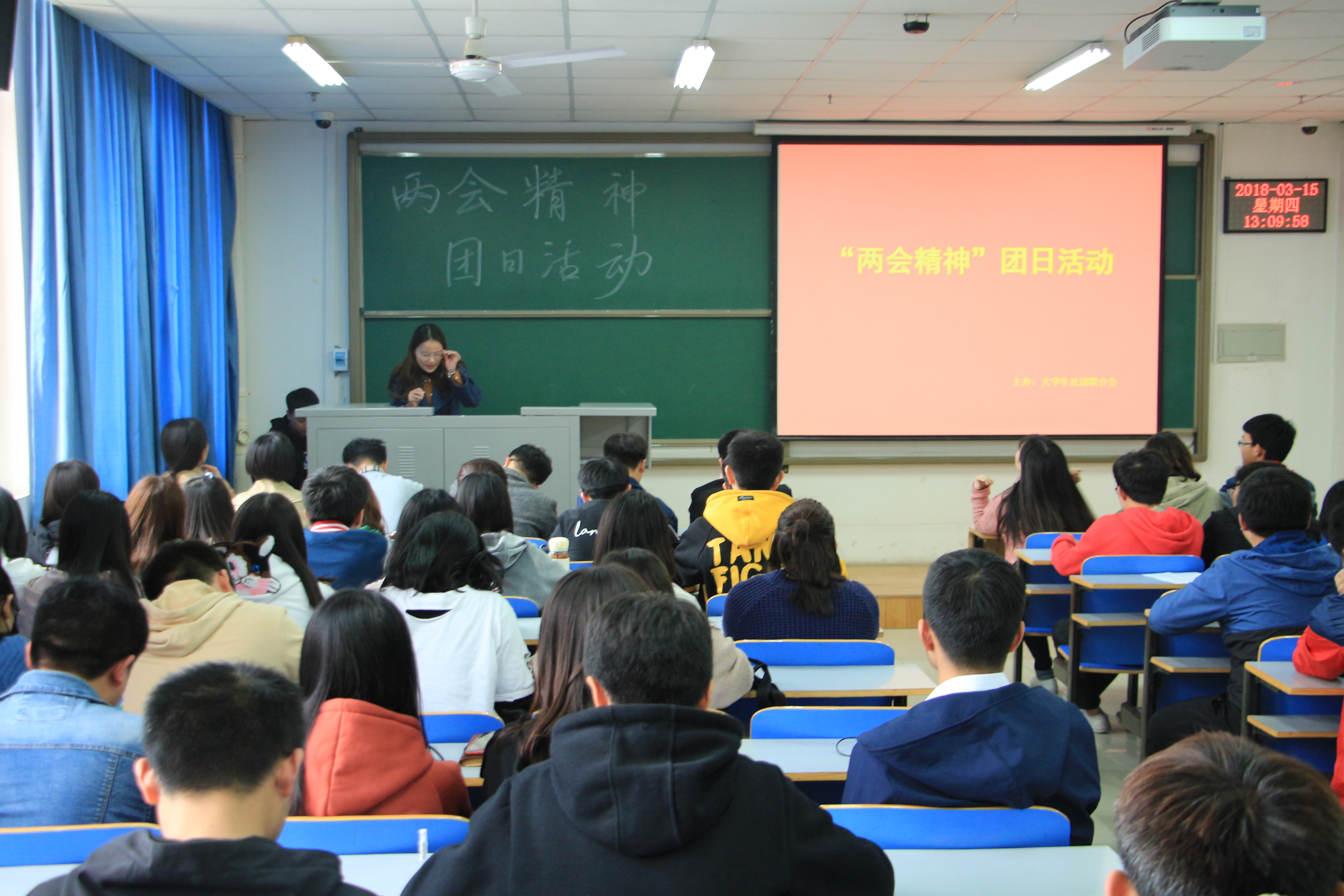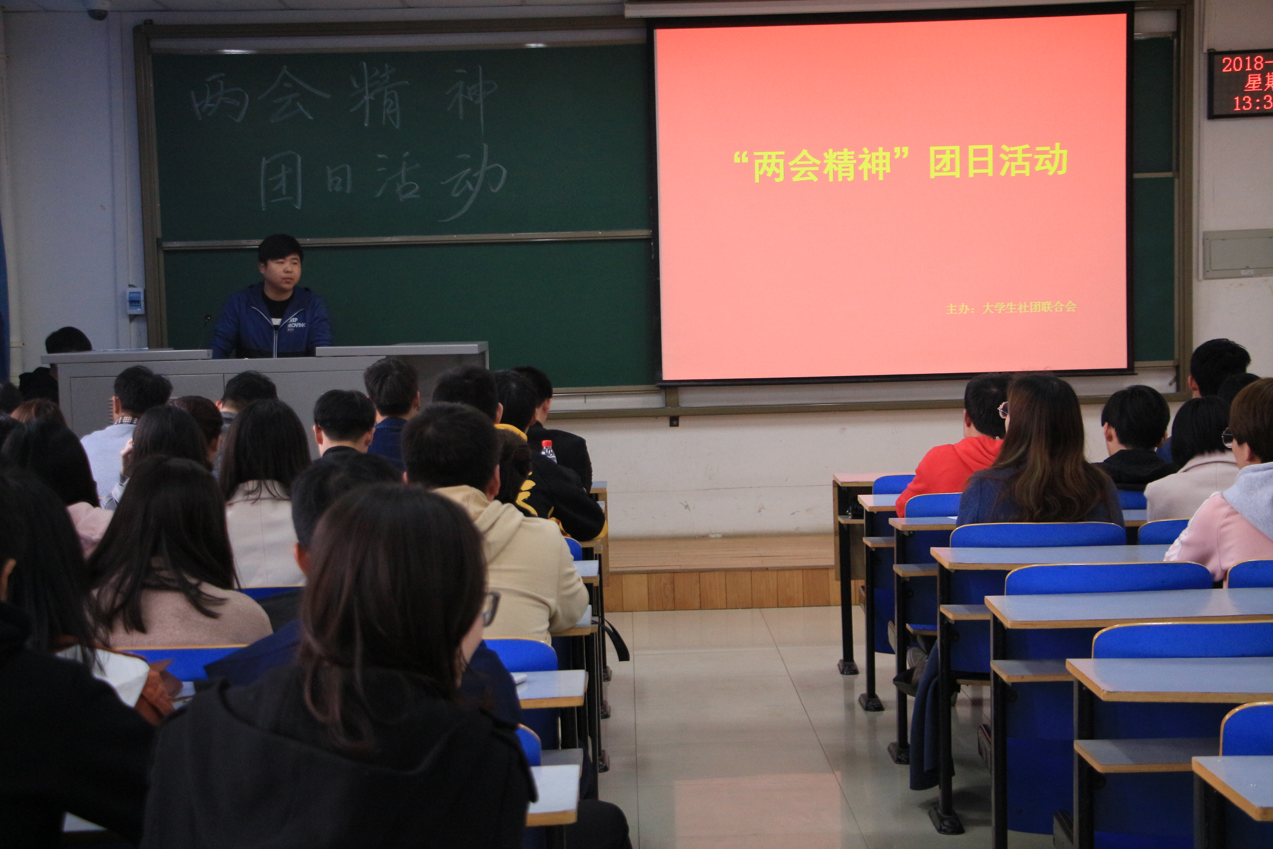 为了培养当代大学生对国家大事的关心度,及时快捷的将国家发展新方向传递给作为新时代接班人的大学生,同时也为了更好的进行社联本学期接下来的工作,3月15日,由大学生社团联合会主办的学习两会精神暨全体大会在科学校区二教楼708室顺利举办,出席本次大会的有社联主席团成员、各部门副部长及大一全体干事,本次会议由监察部副部长黎可欣主持。