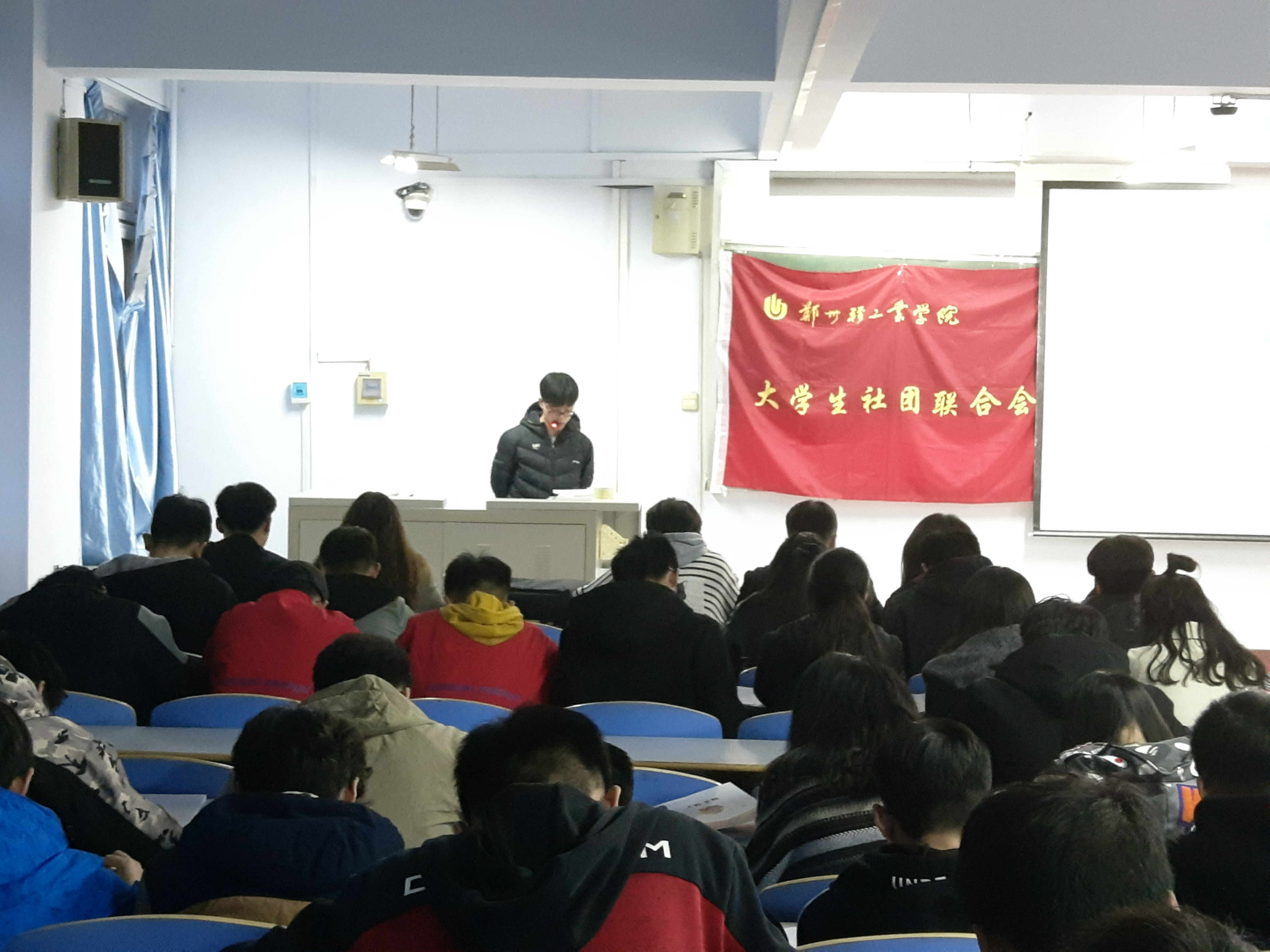 11月11日,由校团委主办,大学生社团联合会承办的第四次党代会精神学习活动暨第一次全体大会在西五楼301室成功举办。出席本次大会的有团工委常务副书记刘啸威、主席团主席陈星铎及社联全体成员。