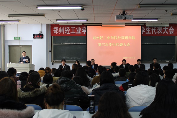 127,郑州轻工业学院外国语学院第三次学生代表大会在教三楼104室隆重召开。外国语学院党总支书记王伟、副书记孔祥娟、校学生会副秘书长张宁、分团委书记刘振卫、学工办主任矫菲及81名学生代表参加大会。