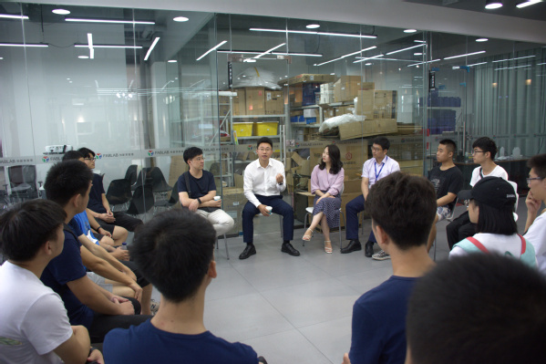 在参观创客空间结束后,创客空间负责人热情地与梅科尔师生进行讨论,队员们向负责人介绍了自己进行的项目研究,并认真听取了他们对各个项目的评价和意见,负责人通过讲述自己创业的故事教导队员们要脚踏实地,敢于发现问题,不断探索创新。