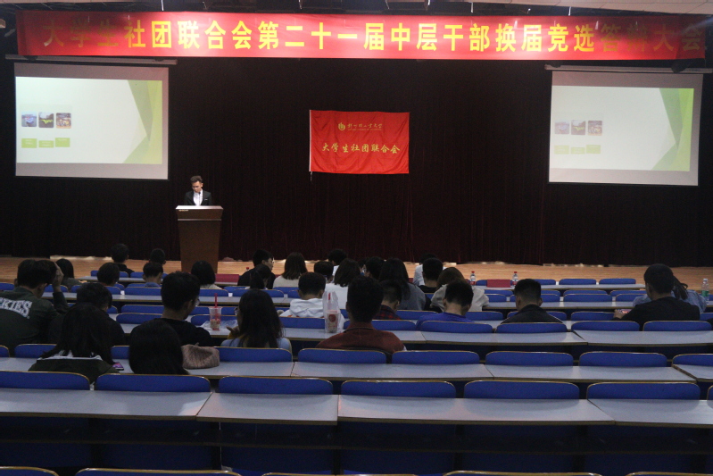 为了保证社联的正常运转,充分发挥社联中层干部的主体作用,更好的贯彻落实校团委的指示和精神,使社联社团更加高效有序的展开工作。10月10日晚,由大学生社团联合会主办的主题为“不忘初心,砥砺前行”的第二十一届中层干部换届答辩大会在活动中心208室成功举办。出席本次大会的嘉宾有:大学生社团联合会常务副主席陈阳、副书记闫宏恩、副主席黎可欣、副秘书长邵鑫鑫等。本次大会由宣传部副部长刘佳伟担任主持人。