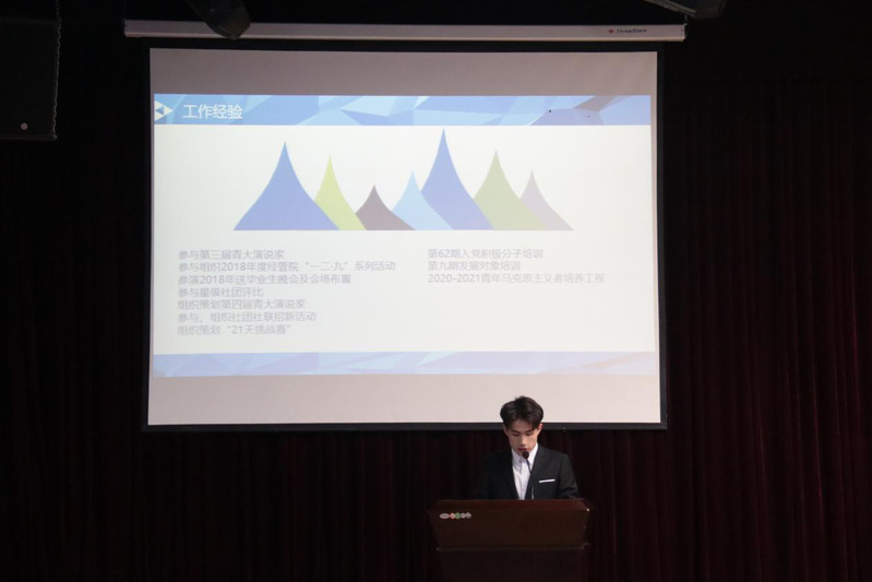 宣传部人员和新媒体人员提前来到会场分别开始布置会场和检查会场设备,随后组织部人员到场,负责社服和各个社团的签到工作,外联部人员负责维持现场秩序,16点大会正式开始。首先由主持人为大家介绍到场嘉宾,并宣读大会注意事项。本次大会秉着公平公正公开的原则由各位竞选者按照事先的抽签顺序以及各部门内部的竞选顺序依次进行演讲答辩。各个竞选者以饱满的热情,慷慨的陈述,并结合自身情况从自我介绍、工作经验、竞争优势、未来展望等多方面结合PPT进行展示演讲。各个竞选者的字里行间都表达出了对工作的认真态度以及对未来的憧憬与期待。在场观众也都认真聆听每一位竞选人员的演讲,整个大会有条不紊的进行,期间掌声不断,气氛热烈。大会最后所有竞选者登台合影留念,到此本次大会画上了圆满的句号。