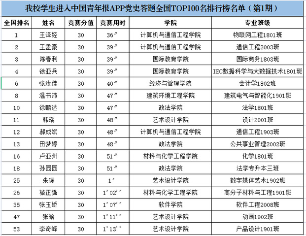根据校团委《关于开展“学党史 强信念 跟党走”庆祝建党100周年网上党史知识竞赛的通知》的要求,学生通过中国青年报APP客户端或团中央“一起学党史”网上答题小程序参与网上党史知识竞答,截止到3月21日,在中国青年报APP客户端第一期党史知识竞答中,我校有20名同学进入全国TOP100榜单,现将已经核实的学生名单公布如下:
