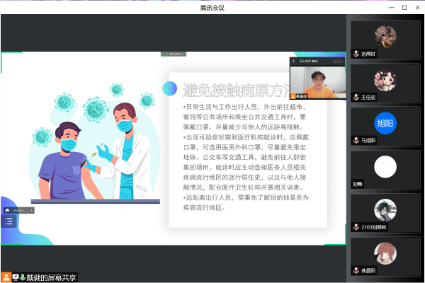 在线上,宣传团以国家的抗疫态度以及群众的防疫现状为主题在腾讯会议平台上为人们讲解现在国家的疫情防控形势和政策,并介绍了疫情防控下人们应如何预防疫情,呼吁大家持续注重自身防护。腾讯会议经大范围宣传吸引了众多网民的关注,纷纷参与会议,并积极点赞讨论。