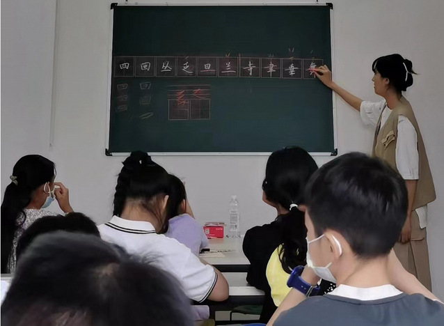 7月3日,实践队员在河南省焦作市孟州市青华园书艺教室针对当地部分留守儿童开展了书法教育活动。队员在讲解时会对每个字剖析开来,教孩子们如何把字写到位,纠正他们的握笔姿势等。课前的认真准备、黑板上的一笔一画,无一不展示着实践队员的严谨态度。书法是中国传统文化艺术,不仅能够提高个人文化素养和思想品味、增强民族自豪感和爱国情怀,也能使孩子们从小热爱生活、热爱艺术、热爱一切美好的事物。