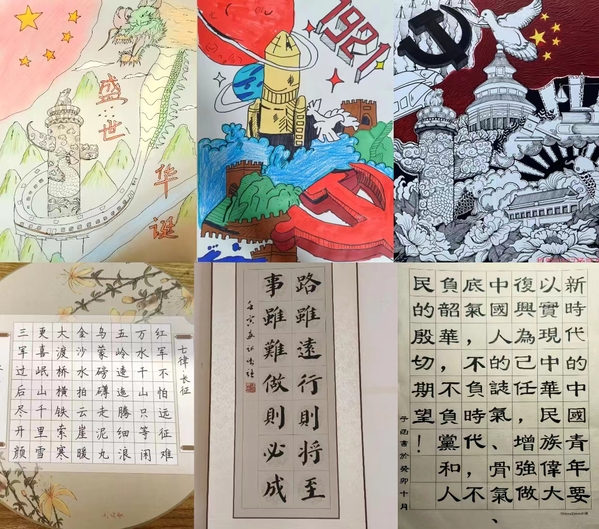 本次活动以习近平新时代中国特色社会主义思想为指导,以书画作品创作为载体,活动期间,我们陆陆续续收到了学生们形式多样的优秀书画作品,有写下《七律·长征》等不朽的诗词来缅怀先辈的;有写下“路虽远行则将至,事虽难做则必成”等名言来明志的;有写下“国泰民安,山河无恙”的、有写下“踔厉奋发,笃行不怠,坚定不移跟党走”。大家将对祖国的爱和习近平总书记的谆谆教诲跃然纸上。