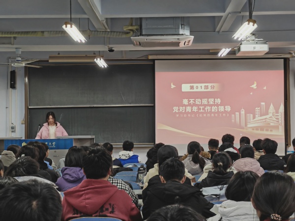 各团支部围绕活动主题,积极筹备并开展团课,团课围绕“毫不动摇坚持党对青年工作的领导”、“新时代的中国青年要以实现中华民族伟大复兴为己任”、“共青团要始终成为紧跟党走在时代前列的先进组织”等多角度,强调党为未来青年工作的进行与发展做出规划,具体阐释了党在青年工作中的重要地位;通过习近平总书记《论党的青年工作》一书强调青年是国家的未来,民族的希望。交流讨论环节,同学们认真思考,积极讨论,一致认为“自古英雄出少年”。同学们纷纷表示,作为一名新青年,不仅要牢记习近平总书记的谆谆教导,紧跟党的步伐,还要不断完善自己,将个人的信念与力量融入党,汇聚成民族复兴的时代洪流。
