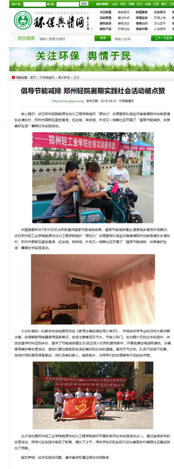 | 2.环保舆情网:倡导节能减排郑州轻院暑期实践社会活动被点赞 |