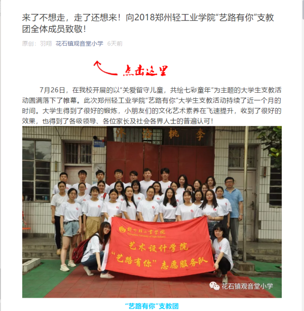 该服务队已被花石镇观音小学公众号报道:(来了不想走,走了还想来!向2018郑州轻工业学院“艺路有你”支教团全体成员致敬!: