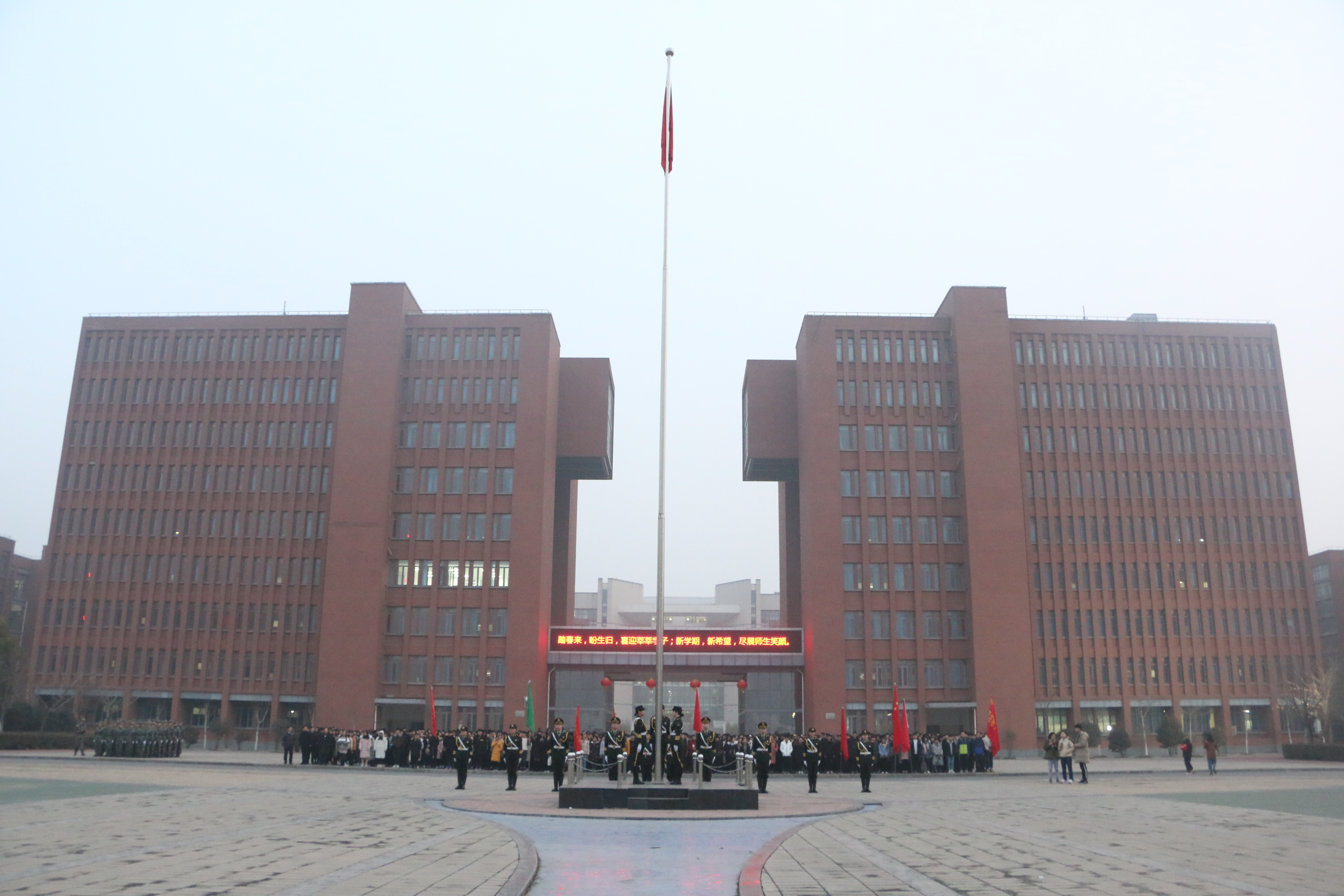 2月25日清晨,我校4300余名师生迎着初春的晨曦齐聚科学校区主教楼广场、东风校区图书馆广场和禹州实习实训基地第二实训楼广场,参加新学期第一天的升国旗仪式活动。