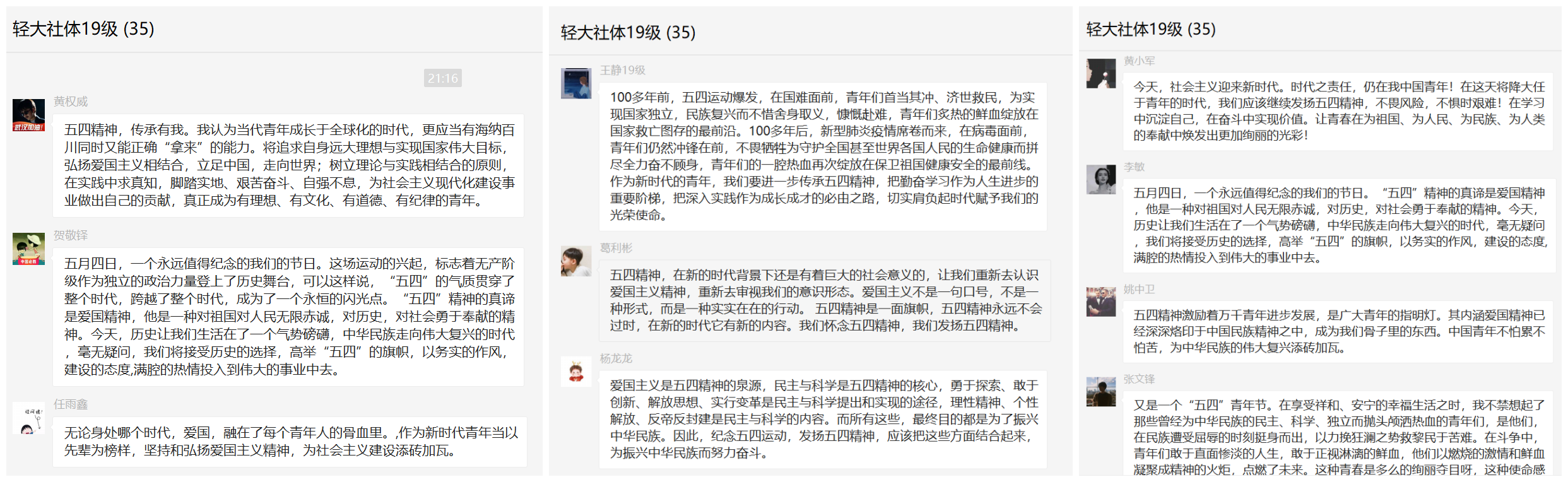 此次团课主要围绕五四精神的内涵、新时代的五四精神、新时代青年团员的历史使命以及青年团员在战疫中的突出贡献等内容展开。团课中,同学们通过PPT和视频重温了五四运动的辉煌历史,深入阐释了新时代五四精神的内涵,进一步加深了对五四运动历史意义和时代价值的理解。通过聆听战疫一线青年团员的感人故事和学习习近平总书记对广大青年的寄语和嘱托,同学们认识到要树牢强烈的家国情怀,勇于为“小家”“大国”奉献青春力量。团课结束后,同学们在班级群积极发表学习感想,表达了在新的历史时期要坚定理想信念,勇于奉献青春的信心和决心。