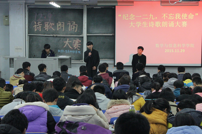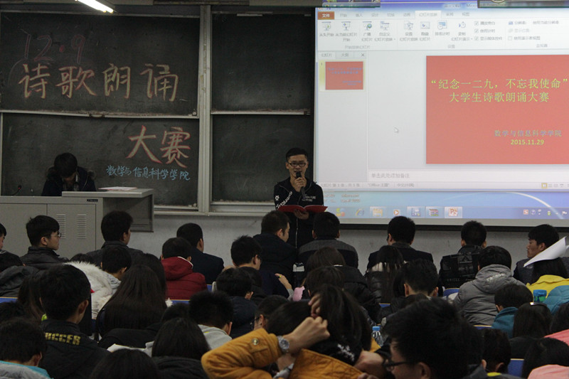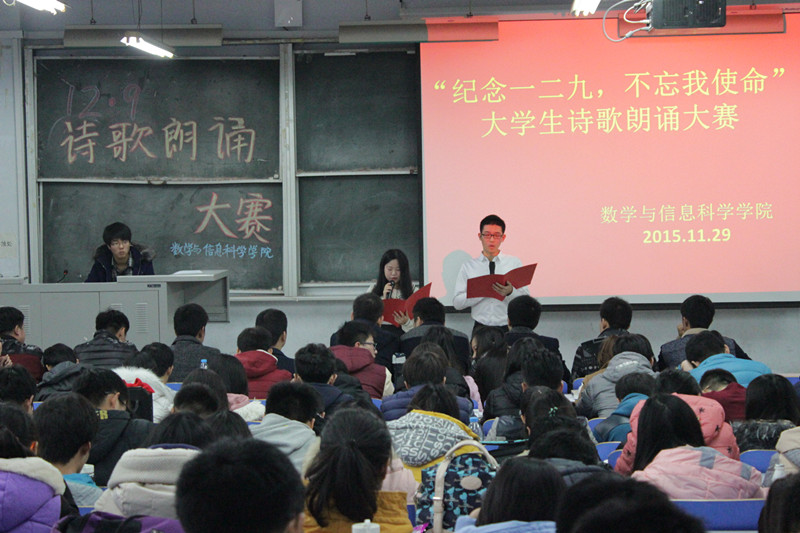 为纪念“一二·九”运动80周年,加强青年团员的思想教育,使广大团员明确青年人肩负的历史责任,发奋学习,报效祖国。11月29日下午,数学与信息科学学院在东一楼218室举办了以“纪念一二九,不忘我使命”为主题的诗歌朗诵比赛。