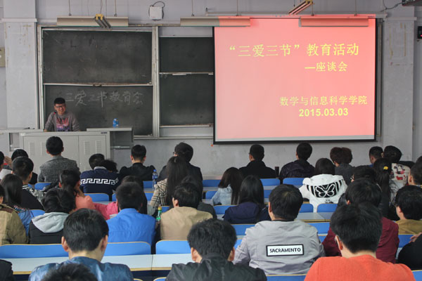 为响应习近平总书记向全国青少年提出的“爱学习、爱劳动、爱祖国;节水、节电、节粮”的号召,3月3日下午4点,数学与信息科学学院在东一楼218开展了以“三爱三节”为主题的教育活动。