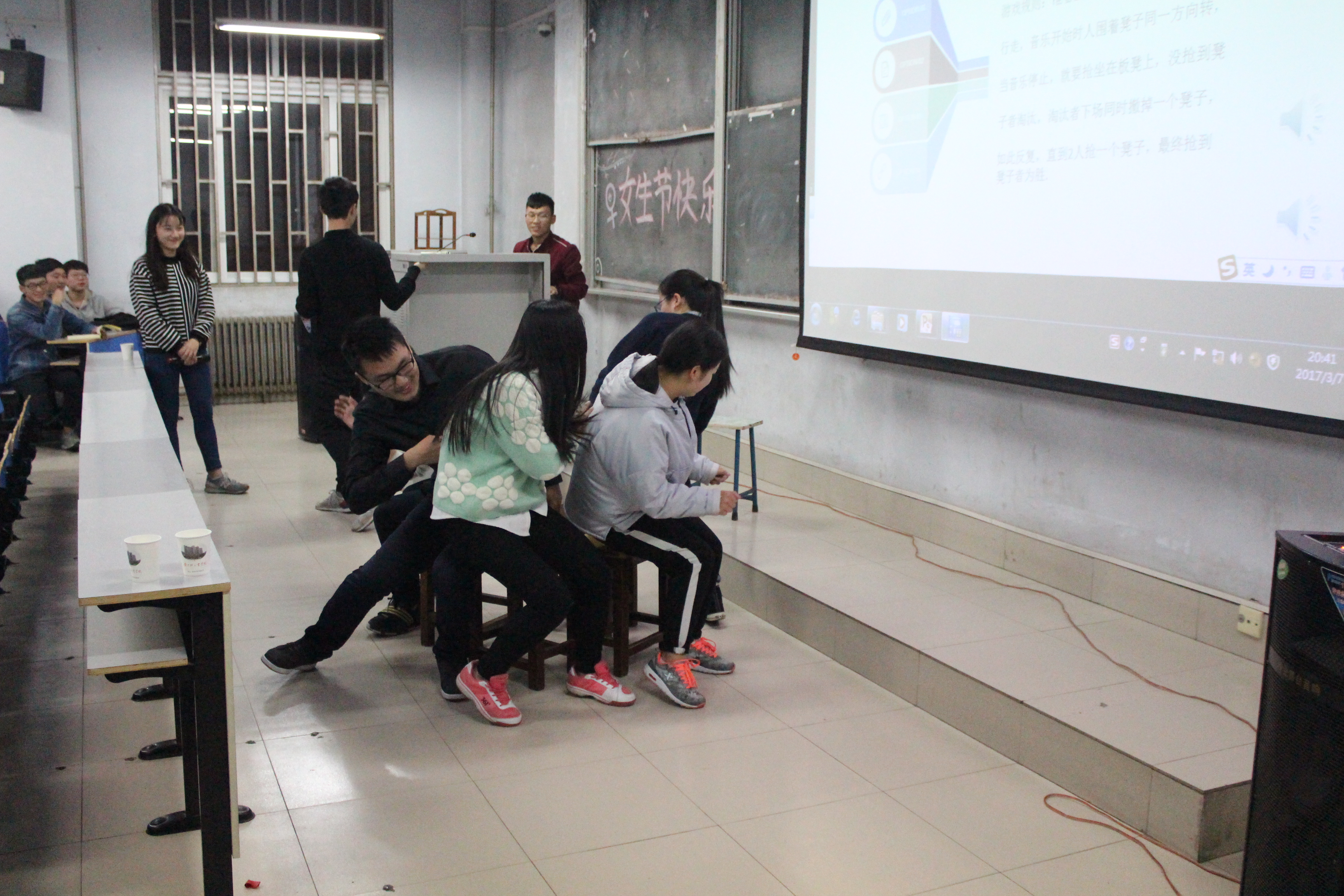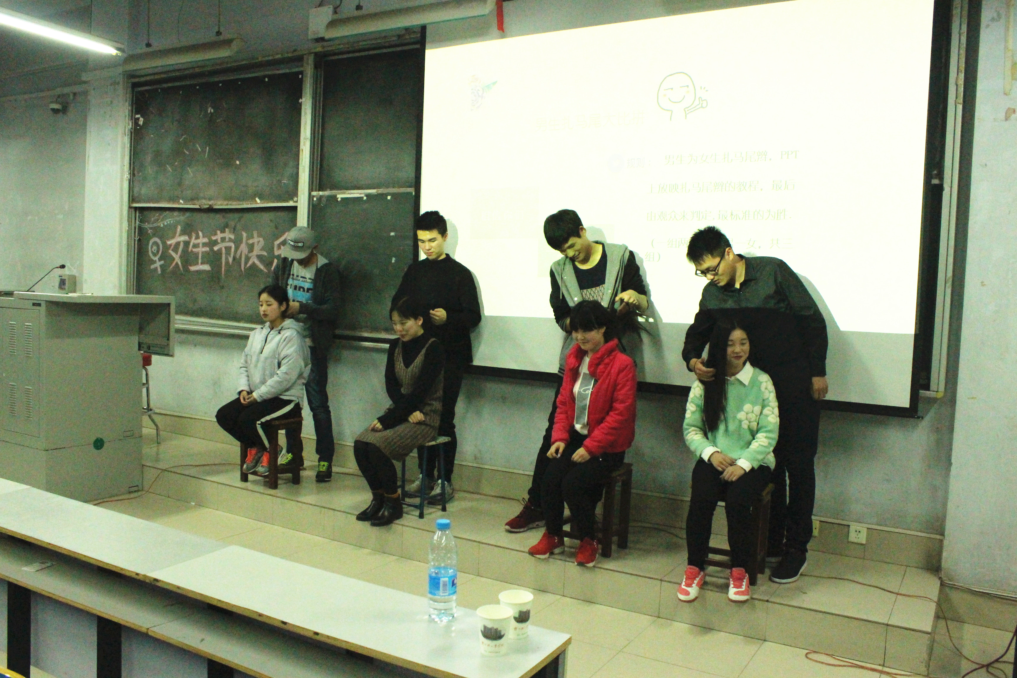此次活动在一首吉他弹唱中拉开了序幕,动人的歌声和悦耳的吉他声感动着在场的每一个人。接下来,现场播放了男生为女生们准备的祝福视频,视频中的男生们十分有心,一个身体摆成的心形映入眼帘,温暖有爱。紧接着是一系列的小游戏,含水说话让每一位女生的笑容更加灿烂;男生踢毽子比赛虽然滑稽,但也十分精彩;抢凳子让男生与女生们使出了浑身解数,最让人难以忘记的是男生为女生扎马尾辫比赛,男生和女生的搭档,成为今晚最抢眼的一幕。男生们小心翼翼,生怕弄疼了女生,从动作来看,他们并不擅长,但的确能够看到他们认真的神情。小游戏结束了,同学们虽意犹未尽,但也笑容满面。游戏过后,是歌曲的演唱,男同学们用饱满热情为女生演唱着歌曲,唱进了每一位女生的心中,动听且温暖。