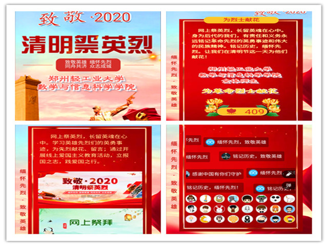 为深入贯彻落实党的十九大提出的弘扬中华优秀传统文化,进一步加强学生爱国主义教育,缅怀先烈、先人和先贤,清明时节,数学与信息科学学院组织开展“网上祭英烈”网络文明传播活动。本次活动以网络宣传为主,充分利用微博、微信和QQ等平台宣传“网上祭英烈,共铸中华魂”为主题的文章、网上献花和为烈士填祭词活动。