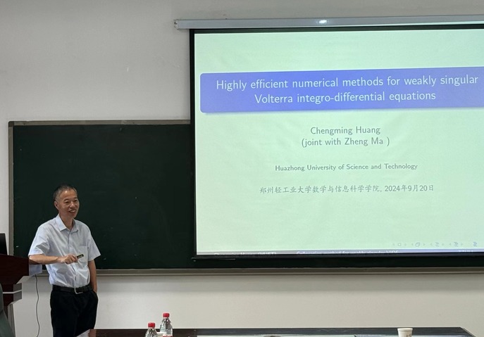 9月20日,应我校数学与信息科学学院和河南省应用数学中心邀请,华中科技大学数学与统计学院黄乘明教授来校学术交流,并做了题为《Highly efficient numerical methods for weakly singular Volterra integro-differential equations》的学术报告,报告会在东一楼310进行。本次报告由数学与信息科学学院副院长黄士国主持,学院相关专业教师、研究生及本科生共同聆听了报告,同时来自郑州大学、河南财经政法大学、河南理工大学的部分老师也参与了学术交流与讨论。