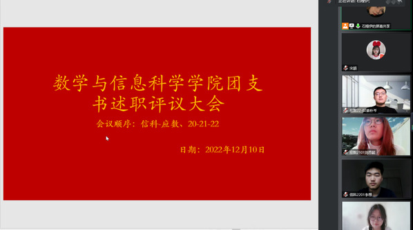 为加强团支部书记队伍建设,扎实推进全面从严治团,提升基层团支部建设活力,12月10日,数学与信息科学学院以腾讯会议的形式召开了2022年度团支书述职评议大会。