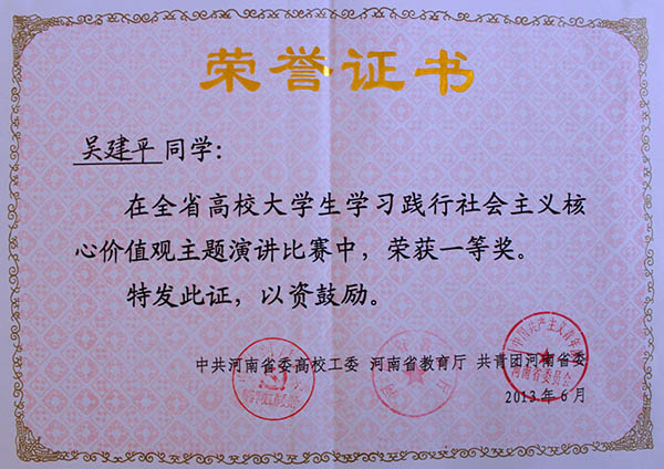 6月3日至4日,河南省高校大学生学习践行社会主义核心价值观主题演讲比赛在河南师范大学举行,我校经济与管理学院2011级学生吴建平以总分第一名的成绩荣获一等奖。同时,食品与生物工程学院2011级学生魏晨光获优秀奖,学校荣获优秀组织奖。