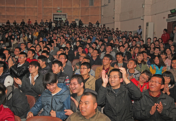 音乐会以一曲充满了河南豫剧特色的《朝阳沟序曲》拉开序幕。序曲音乐在大家耳熟能详的豫剧《朝阳沟》旋律的基础上,采用了交响乐式的展开,表现出一种中西交融、具有现代气息的音乐风格,给传统戏曲音乐赋予了新的生命力。随后,富有民族特色的《瑶族舞曲》、热情如火的《卡门组曲》、乐队首席刘志云先生精彩的小提琴独奏《沉思》、新疆民歌改编的《掀起你的盖头来》,以及震撼人心、经久不衰的《贝多芬命运交响曲》第一乐章等交响乐曲目纷纷呈现,精彩的演出无一不牵动着现场听众的心,赢得台下阵阵热烈的掌声。最后,《拉德斯基进行曲》将整场音乐会推向高潮,现场师生不禁跟随乐队指挥、按着音乐节拍鼓掌,与台上精彩的演奏合拍同调。一时间,掌声、音乐声激荡在整个礼堂。音乐会在现场师生激动的欢呼声中圆满结束。