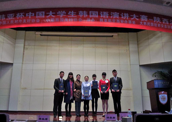本次比赛由中国人民对外友好协会、中国韩国友好协会与韩国中国友好协会共同主办,来自西安外国语大学、渭南师范学院、西安翻译学院和我校等4所高校的20名韩国语专业学生参赛。我校李爱子、尹悦老师指导的5名朝鲜语系学生参加了比赛。