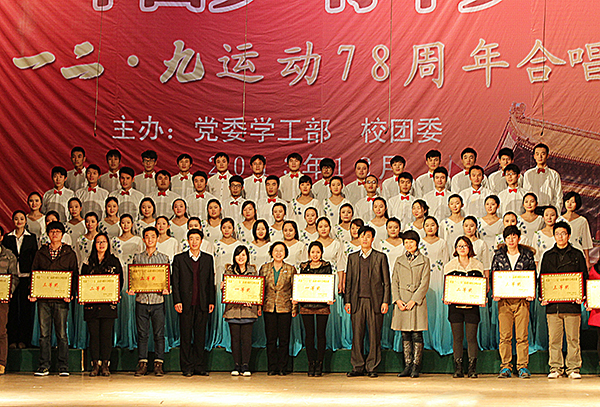 12月5日下午,我校在东风校区大礼堂成功举办纪念“一二•九”运动78周年合唱比赛。此次比赛由党委学工部、校团委主办,全校14个院(系)的代表队参加了比赛。校党委副书记张胜利教授出席并为获奖单位颁发了奖牌,宣传部、学工部、团委等部门负责人及院(系)近1200名师生观看了比赛。