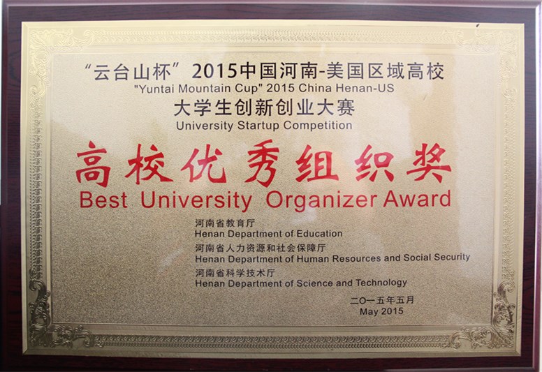 近日,由河南省教育厅、河南省人力资源和社会保障厅、河南省科技厅联合举办的“云台山杯”2015中国河南—美国区域高校大学生创新创业大赛总决赛在郑州大学西亚斯国际学院圆满落幕。我校选派的创业团队取得优异成绩,并荣获“高校优秀组织奖”。