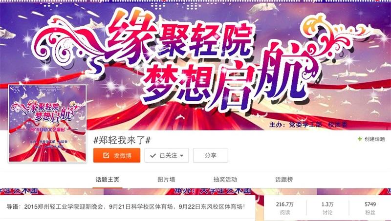演出共分“缘聚轻院”、“缤纷校园”、“梦想启航”三个篇章,包含演唱、舞蹈、朗诵、器乐、小品、歌曲、时装秀等多种艺术形式,形式多样、内涵丰富的文艺节目,展现了我校深厚的文化底蕴和轻院学子朝气蓬勃的青春风采,表达了同学们对校园生活的热爱、对艺术的执着追求及对学弟学妹的欢迎和祝福。当晚的微博互动话题“#郑轻我来了#”更是上升到新浪微博热门话题,阅读量达到216万,参与话题讨论达1.3万人次,位列新浪微博创意征集分类排行榜第3名,极大地扩大了我校的知名度。