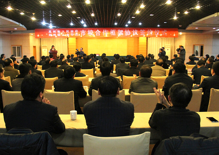 禹州市委书记王志宏致辞。他认为,郑州轻工业学院作为河南省重点建设高校和中南地区唯一的以轻工、食品、电器、工业设计为特色的本科高校,在发展战略和人才培育方向上和禹州市有许多契合之处。郑州轻工业学院与禹州的教育工作对接,对盘活禹州现有的教育资源、扩大优质教育资源的供给,对促进禹州钧陶瓷产业创新发展、提升产业竞争力,对带动人口和产业加速聚集,加快新型城镇化进程等方面都有不可估量的推动作用。他表示,禹州市一定要珍惜这次难得机会,本着真诚合作、优势互补、资源共享、共同发展的原则,积极创造良好环境和条件,使禹州成为轻工业学院理想的科研基地、创新基地、实验基地和科研成果转化基地。