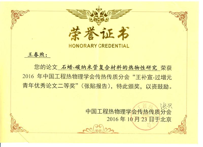 从中国工程热物理学会传热传质学2016年学术年会上传来喜讯,由我校吴学红副教授指导的研究生王春煦同学的论文《石蜡-碳纳米管复合材料的热物性研究》荣获2016年中国工程热物理学会传热传质分会“王补宣-过增元青年优秀论文二等奖”(张贴报告),该奖项以工程热物理学科两位院士王补宣和过增元的名字命名。这是我校研究生第一次在传热传质领域获得该奖项,给学校增添了荣誉。此次会议共收到论文800余篇,大会选出130篇论文作为口头报告,其余为张贴报告。我校研究生投稿论文6篇,其中李灿同学(指导老师龚毅教授和吴学红副教授)的论文为口头报告,其余5篇为张贴报告。大会评审选出51篇论文参评优秀论文,其中21篇作为口头报告。最终大会评选出口头报告一等奖1篇,二等奖10篇;张贴报告一等奖1篇,二等奖10篇。此次会议的优秀论文将会被推荐到《科学通报》、《工程热物理学报》、《化工学报》上发表。