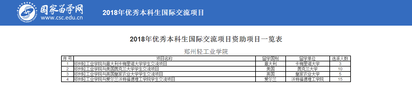 近日,国家留学基金委公布2018年优秀本科生国际交流项目(以下简称为“优本项目”)评审结果,我校申报的郑州轻工业学院与意大利卡梅里诺大学、美国奥克兰大学、英国皇家农业大学、爱尔兰沃特福德理工学院的4项学生国际交流项目全部榜上有名,获得公派名额33个,连续两年荣获河南省高校第一。 据悉,2018年国家留学基金委“优本项目”选派名额为4500名(比2017年减少500名),河南省郑州大学等5所高校共获得72个公派名额。此次是我校继2017年后再次获批国家留学基金委“优本项目”。 国家留学基金委设立的“优本项目”,旨在充分发挥国家公派出国留学的政策导向和带头作用,进一步推动国内高水平大学与世界知名大学及机构合作,促进多元文化交流,提高学生创新意识、实践能力与国际竞争力,满足国家急需专业、学科领域高素质国际化人才培养需求。该项目以各高校与海外知名高校签署的校际学生(本科生)交流协议为依托,资助优秀本科生以交换、插班形式赴国外合作院校进行课程学习,或赴国际组织、实验室、企业等进行科研实习,时限为3个月至12个月。我校4个项目的时限,除英国皇家农业大学是6个月以外,其他三个项目均为12个月。 两年来,国际处利用国家留学基金委“优本项目”这个国家级平台,积极做好项目设计、申报、宣传、选拔、跟踪管理及发展规划工作,2017年项目执行情况及学生管理得到国家留学基金委的肯定。“优本项目”提升了我校学生国际交流的水平,也为我校本科学生的国际交流开辟了更多的渠道。