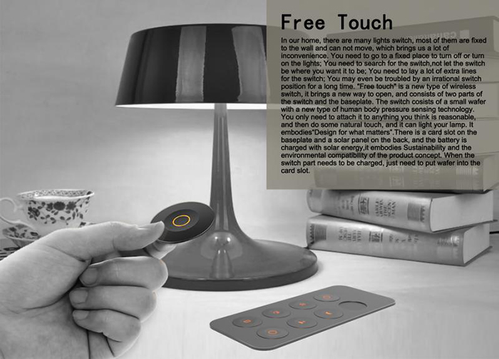 “Free Touch”是一种新型的无线开关,它带来一种全新的家庭照明系统的开启方式。它由开关和底板两部分组成,开关部分是小巧的圆片,采用新型的人体压力感应技术,人只需把它贴在任何自己认为合理的地方,然后做一些自然的触碰,就能点亮灯具。底板部分设有卡槽,背部设有太阳能光伏板,采用太阳能充电,体现了可持续的设计理念。当开关部分需要充电时,将圆片放入卡槽即可。