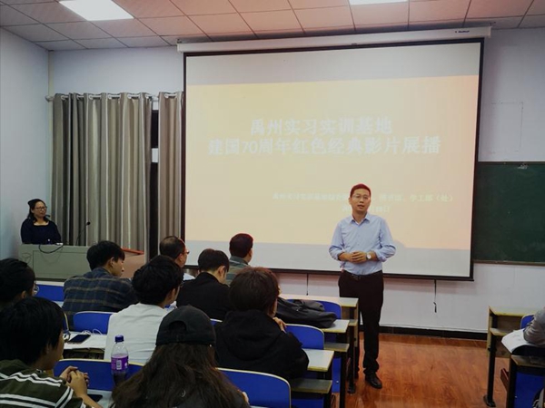 值此中华人民共和国成立70周年之际,为培养学生们的爱国情操和革命情怀,禹州实习实训基地综合服务中心、学工部(处)和图书馆共同组织为期两个月(2019年9月18日——2019年11月21日)的红色经典影片展播活动。2019年9月18日,禹州实习实训基地在一号实训楼A座407教室举行“国庆70周年红色经典影片展播活动”开播仪式,禹州实习实训基地综合服务中心主任刘俊校、副主任付金华和学生处副处长沈高峰、电气信息工程学院、计算机与通讯工程学院、艺术设计学院带队老师和学生代表参加。开播仪式由禹州实习实训基地综合服务中心学生工作办公室丁俊霞老师主持。