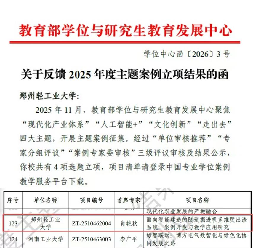 近日,教育部学位与研究生教育发展中心公布了2025年度主题案例征集立项结果。我院肖艳秋教授主持的《面向智能建造的隧道掘进机多维度出渣系统:案例开发与教学应用研究》成功获批立项。这是我国研究生教育层次最高、权威性最强的案例建设类项目,标志着我院在案例开发与研究领域取得重要突破,充分彰显了学院在案例研究领域的深厚积淀与发展优势。