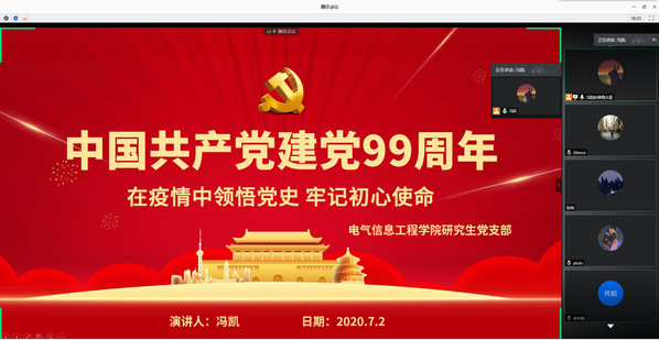 中国共产党从诞生至今,走过了99年的光辉历程。为庆祝我党成立99周年,2020年7月1日起,电气信息工程学院研究生党支部借助腾讯会议平台开展七一主题系列党日系列活动。李灏萱老师主持,支部全体党员参加此次会议。
